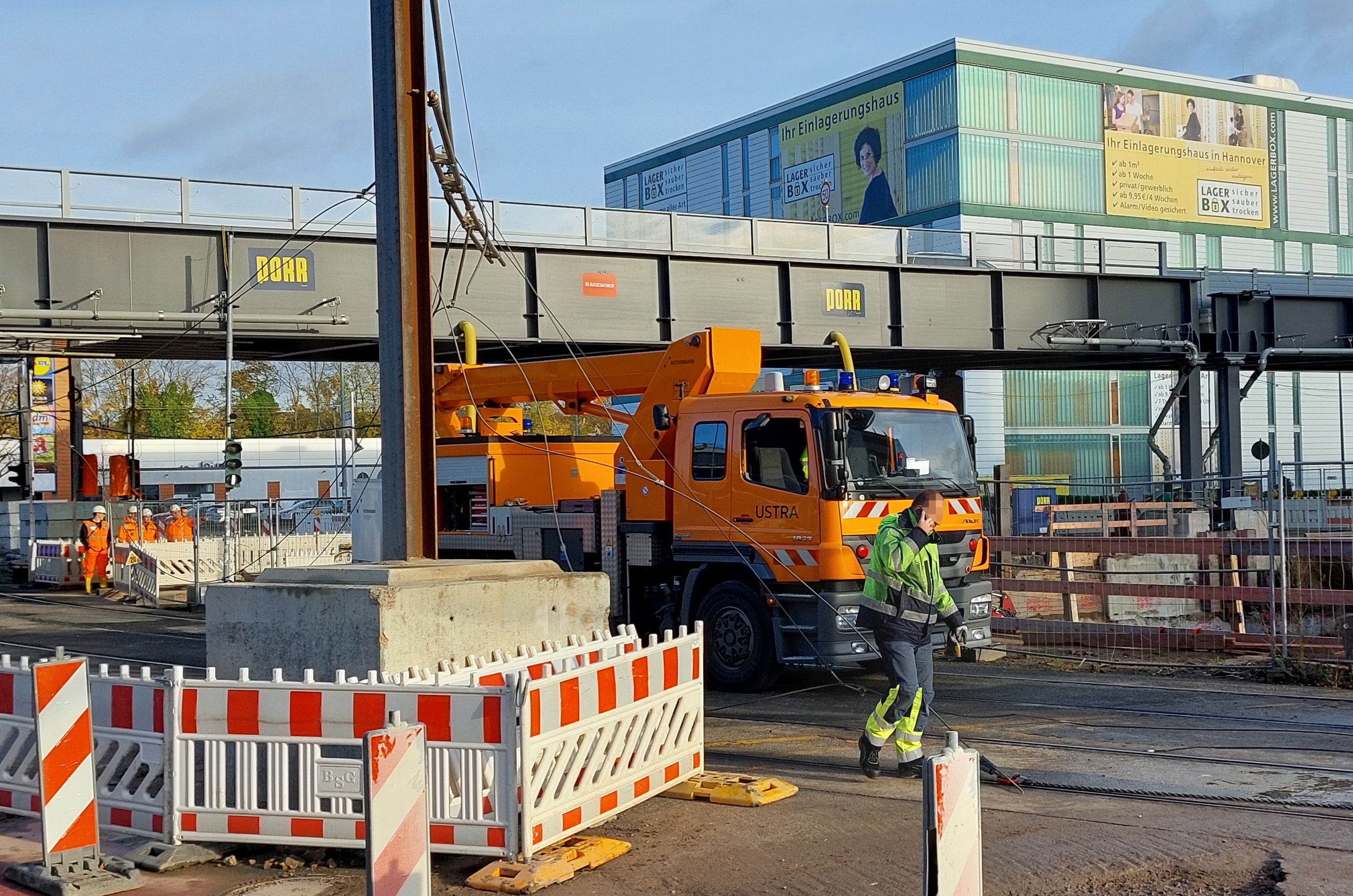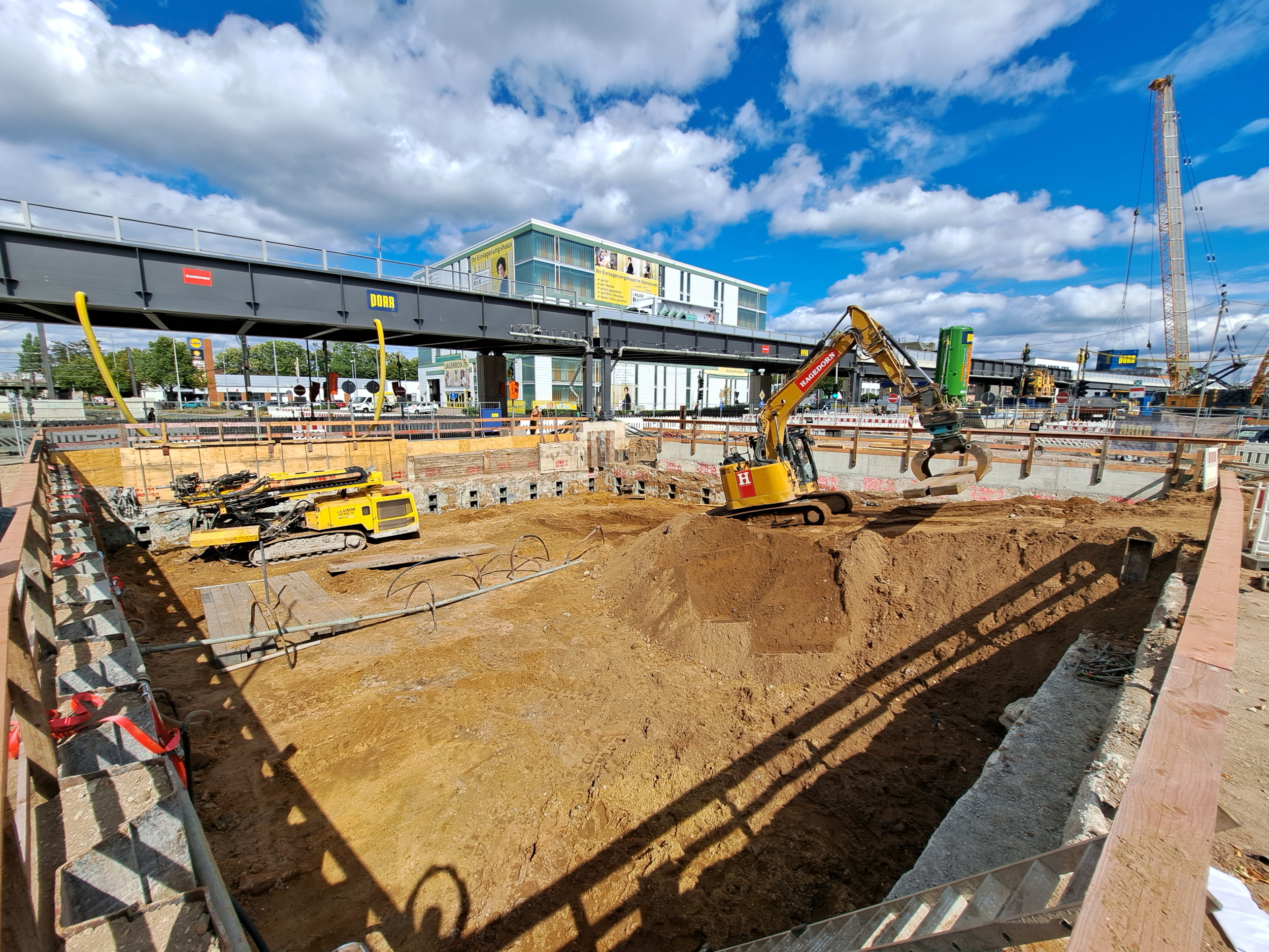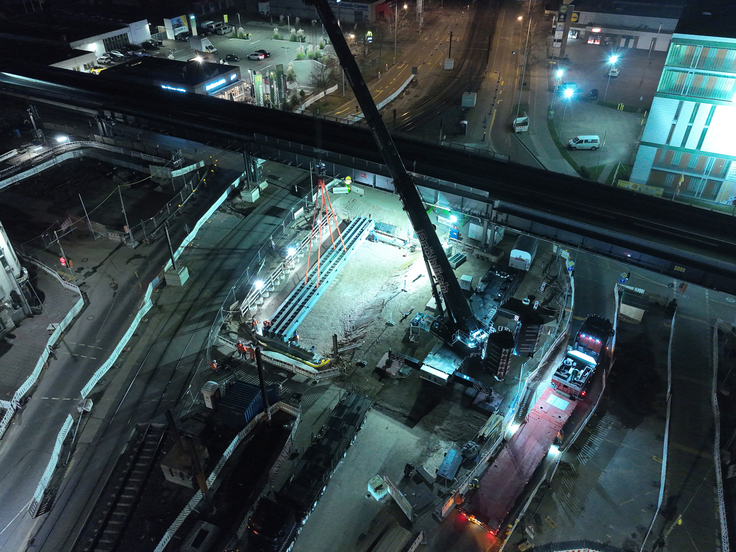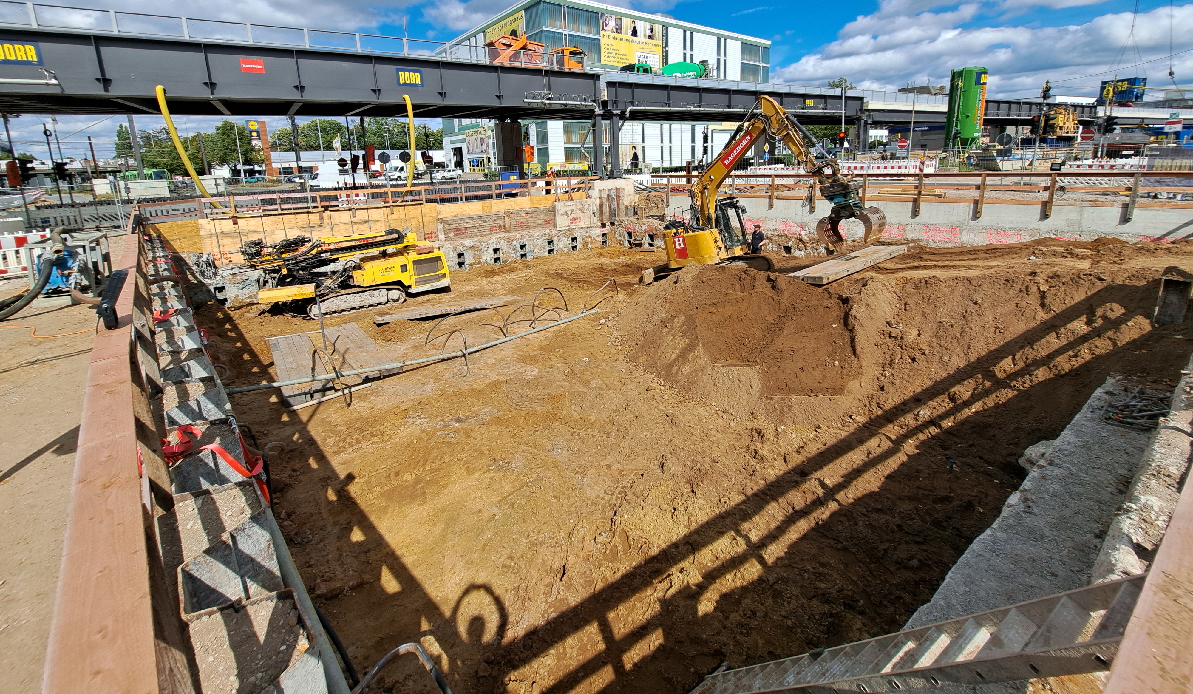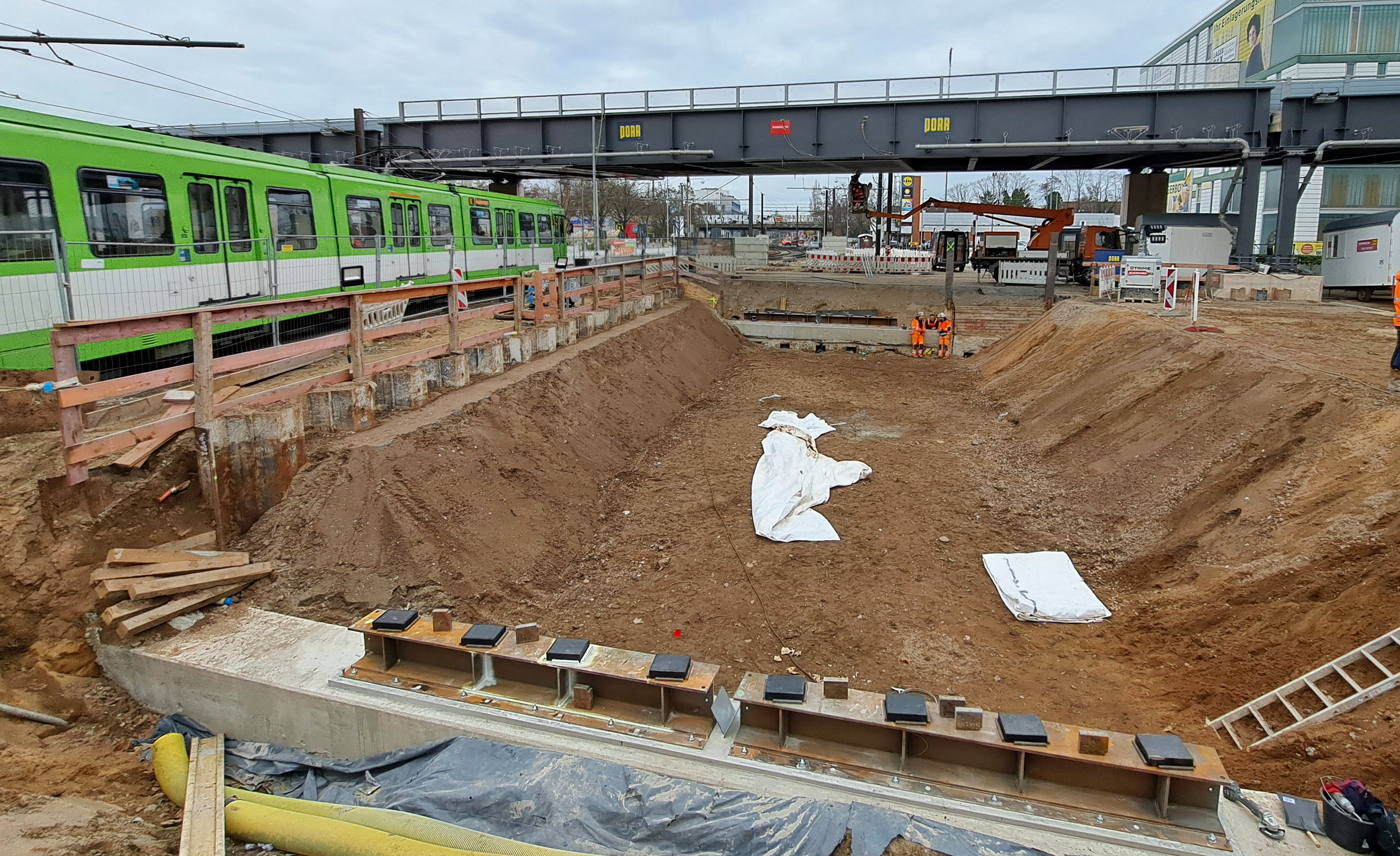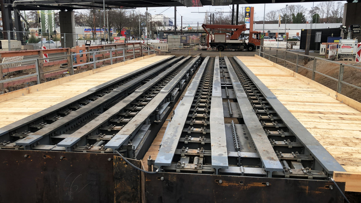 Ein echter Brennpunkt der Tunnelbaustelle ist unser Baudock 8 – die Kreuzung Hildesheimer Straße. Logistik und Technik verdichten sich dort auf so engem Raum, dass sich ein regelmäßiger Blick lohnt. Die Herausforderung heute: Wir bauen Behelfsbrücken für die Stadtbahngleise. Und das geht so.