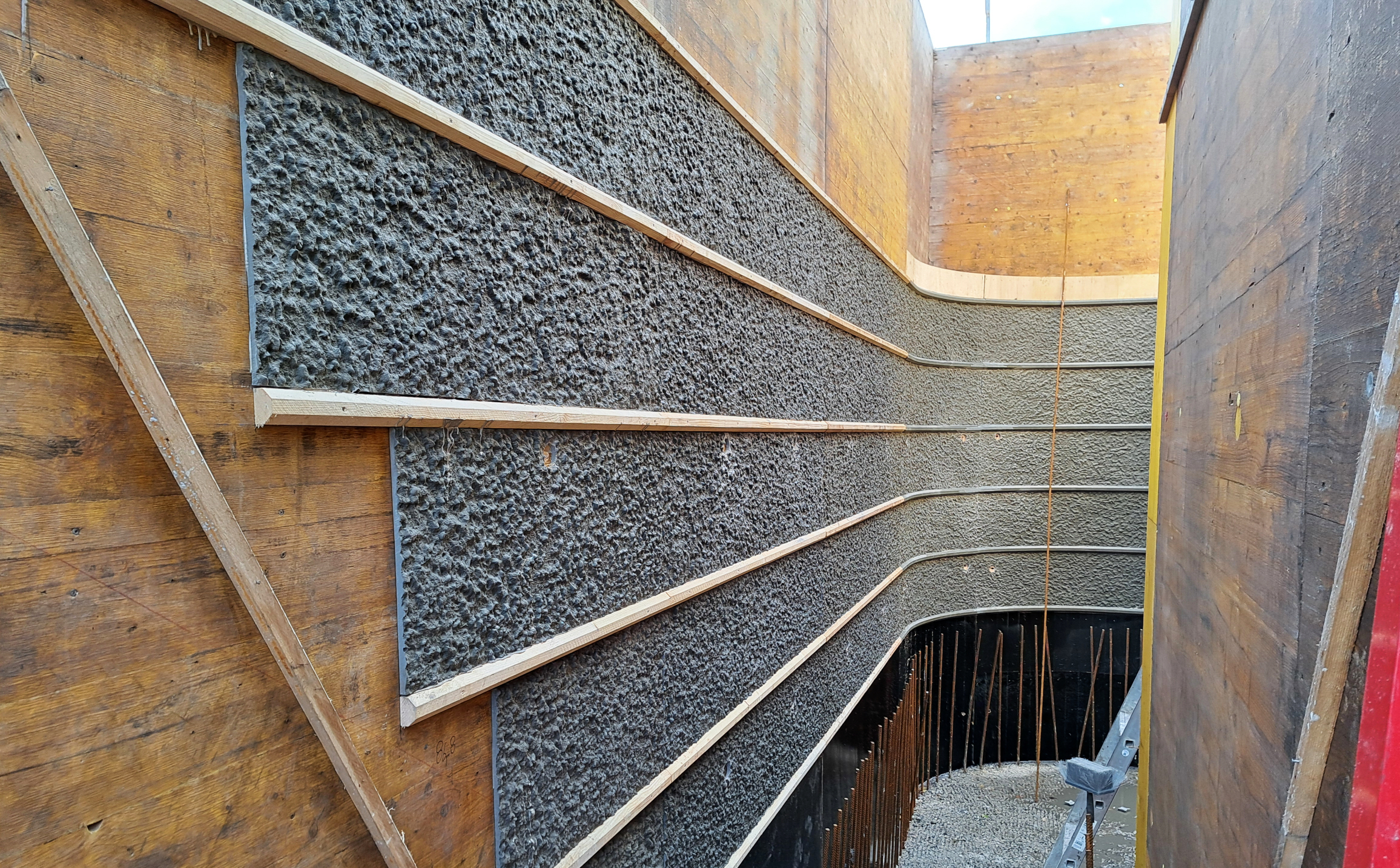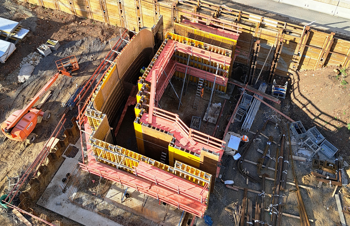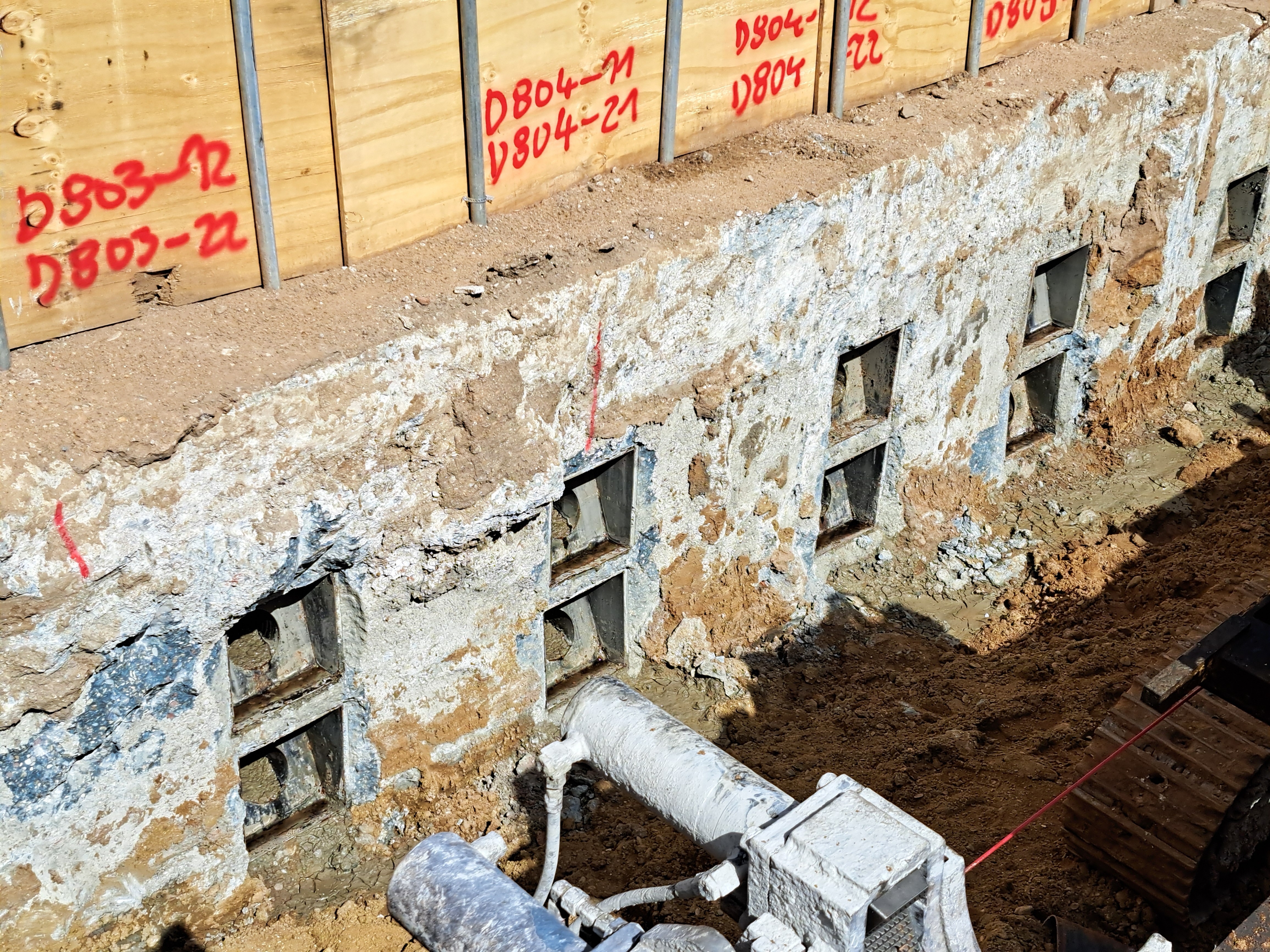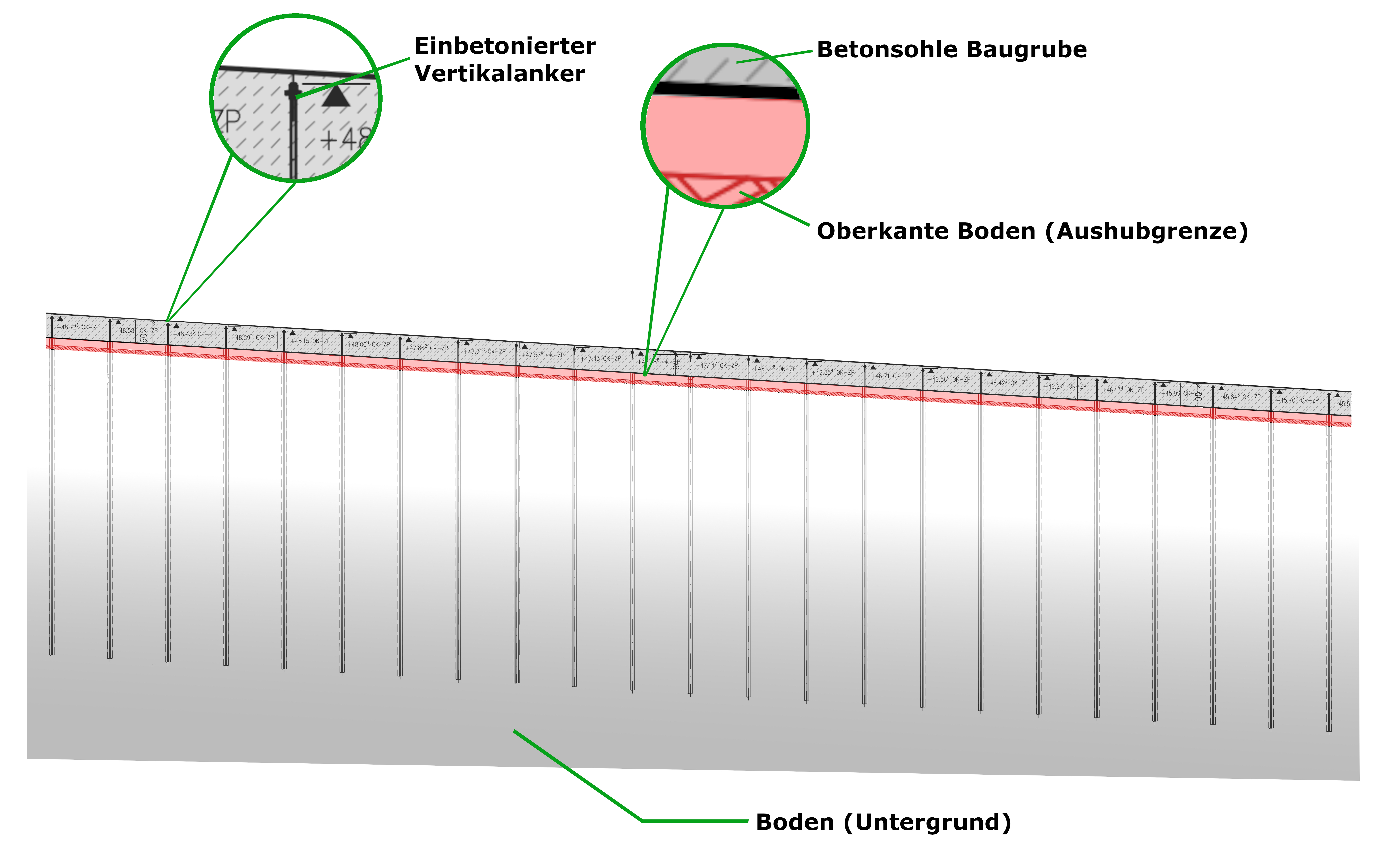 Übrigens: Die senkrechten Linien im Plan, die von der Aushuboberkante nach unten abgehen, sind die schon einmal beschriebenen vertikalen Zugkanker (vgl. Beitrag vom 31.07.2025, „Maximale Bodenhaftung“). Ihre oberen Enden sind auch auf einem Foto unten im Bereich der Tunnelrampe zu sehen: die etwa 80 Pinöckel, die dort in den Himmel ragen.