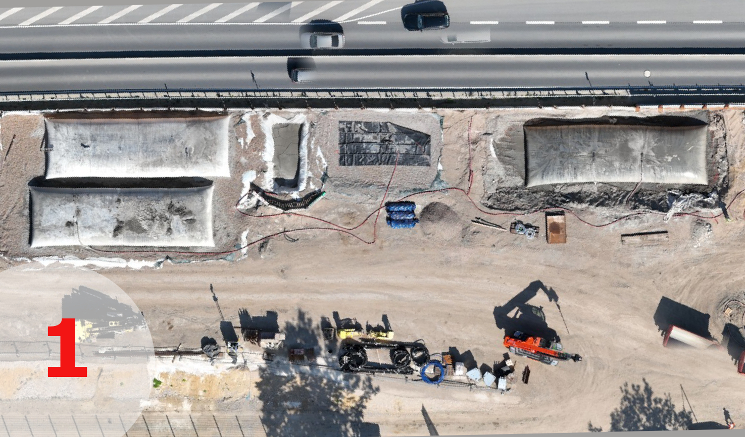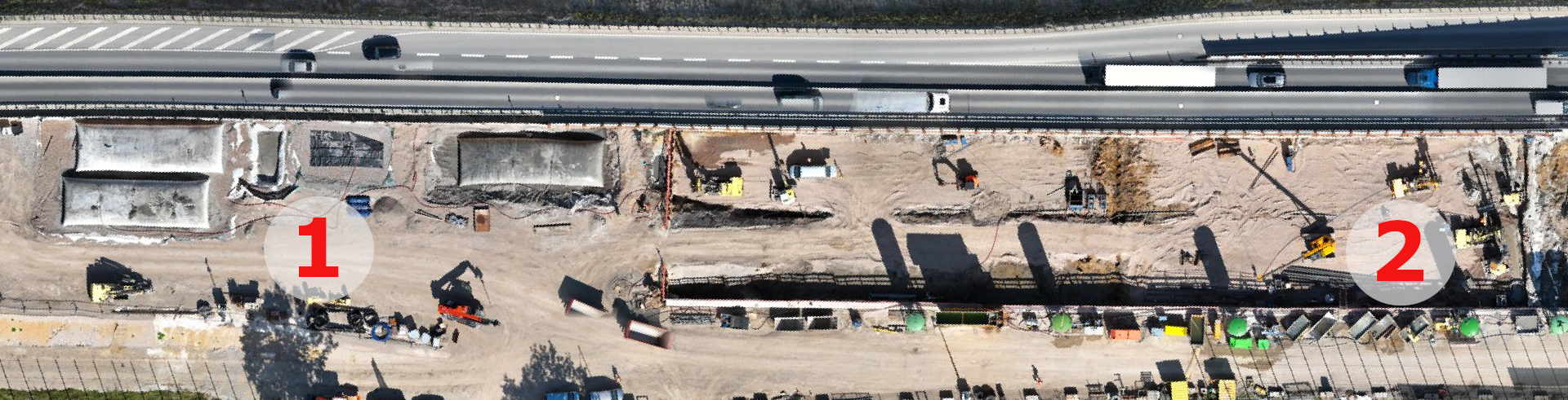 Insgesamt etwa 1,5 Hektar müssen in der nächsten Woche so vorbereitet werden, dass die nächsten Arbeitsschritte im Projekt ablaufen können. Die Flächen liegen beiderseits der Strecke. Die Arbeitsgeräte brauchen deshalb den ganzen Platz auf den Fahrbahnen. Damit das möglich ist, müssen wir nicht zuletzt die Beton-Mitteltrennung herausheben und – was viel aufwändiger ist – anschließend wieder zusammenfummeln. An eine sichere Passage für den Verkehr ist dabei beim besten Willen nicht zu denken