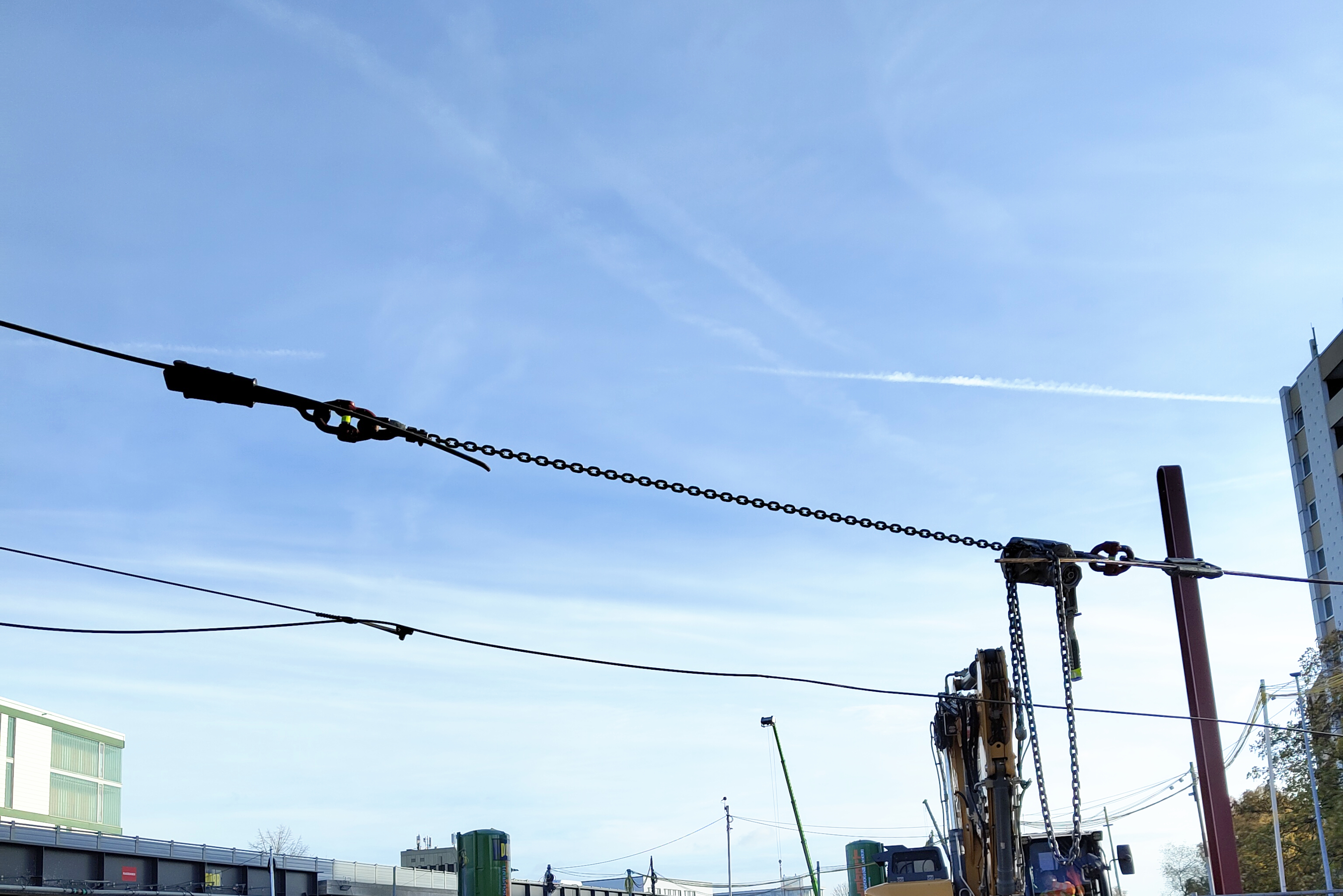 Mit Blick auf den Gleisverschwenk können jetzt die letzten Schritte getan werden. Zum Beispiel setzen unsere Experten die Oberleitungsmasten auf die Fundamente, die wir in den verganenen Wochen hergestellt haben. Außerdem werden die Schienen auf die Längsträger der Behelfsbrücken aufgebaut.