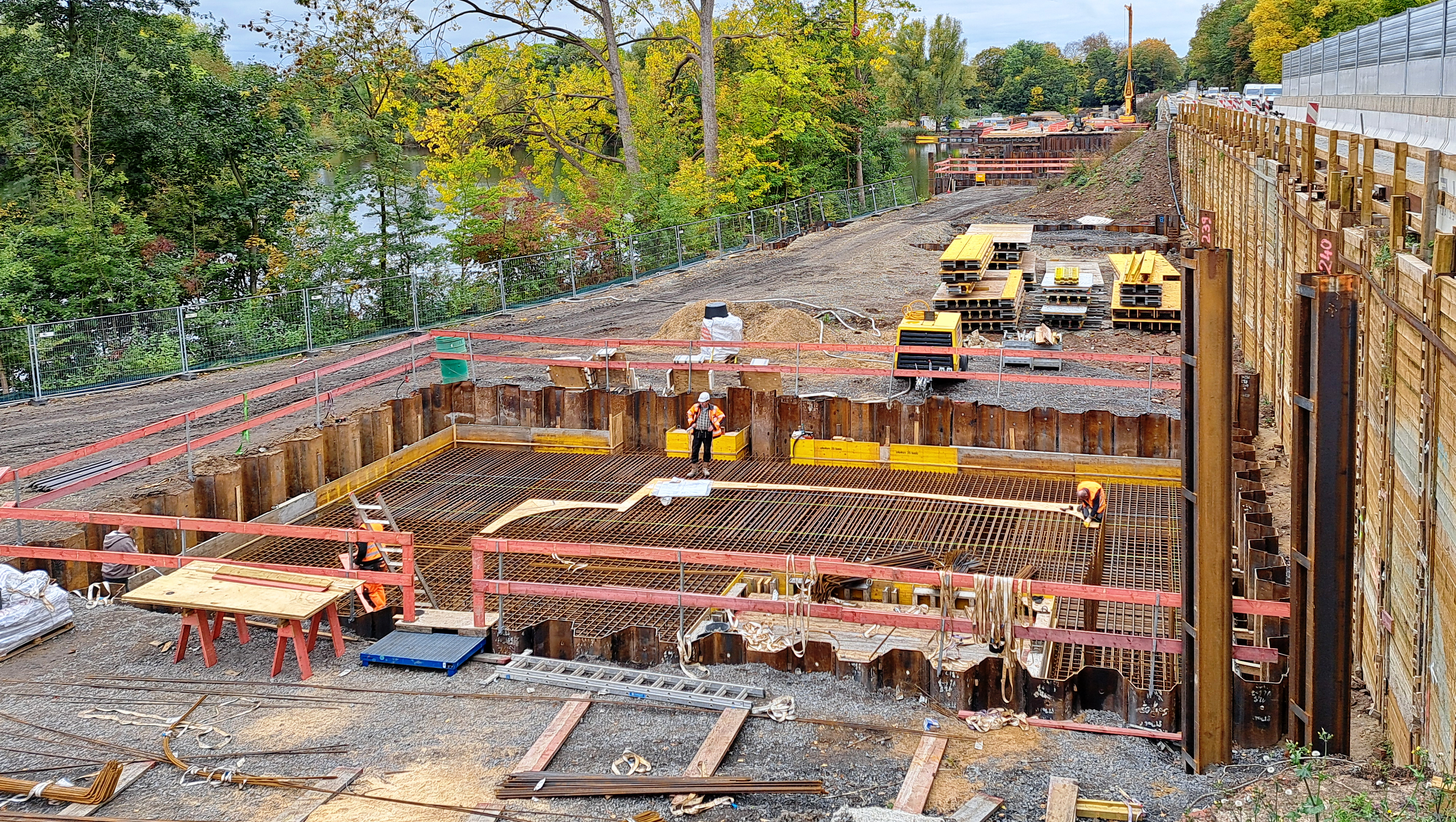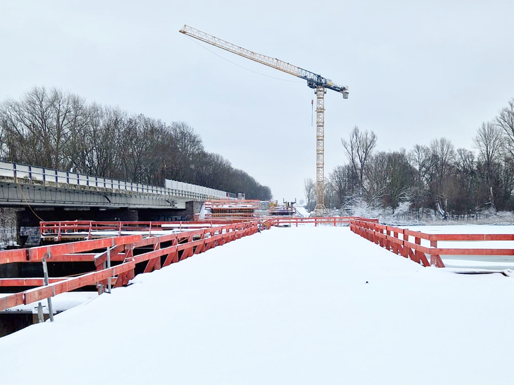 Außerdem sollen die Vorbereitungen für die Arbeit an den nördlichen Brückenhälften (Teilbauwerken) der beiden Großbrücken starten – die Leineflutmuldenbrücke über den Kiesteich und die Leinebrücke. Auch dort richten wir die letzten Baustellenflächen ein.