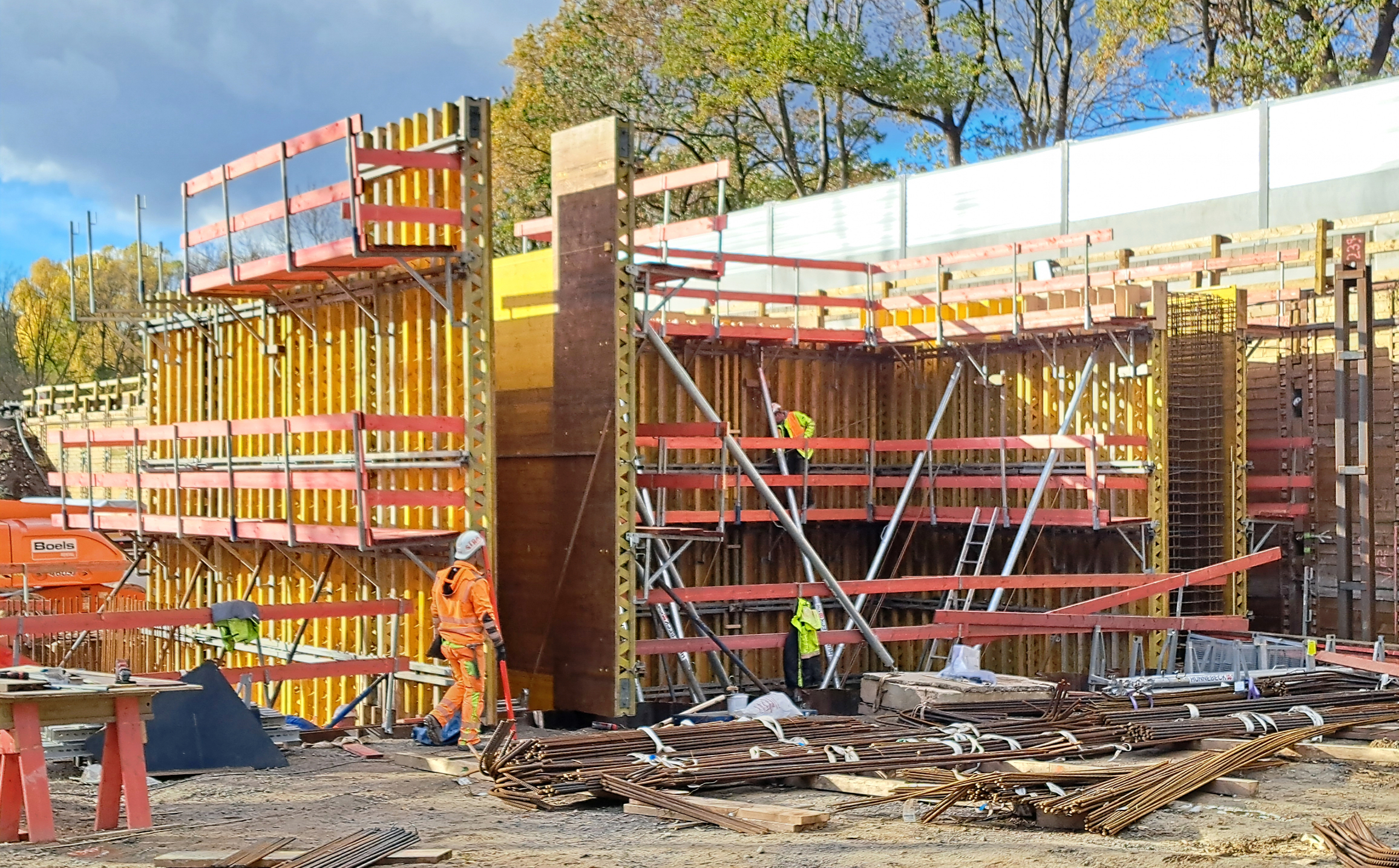 Das bedeutet: Zum einen ist das Wassermanagement in der Baugrube nicht ganz so schwierig, wie an den Tunnelportalen. Zum anderen ragen die künftigen Baugrubenwände (Schlitzwände) so weit aus der späteren Tunnelsohle heraus, dass sie versteift werden müssen. Denn eine Wand, die zwar einen Meter dick, aber immerhin 14 Meter hoch ist, bietet den Kräften des umgebenden Bodens langfristig nicht genügend Widerstand. Obwohl sie bereits mit Verpressankern horizontal gesichert (im Boden verdübelt) ist (vgl. z.B. Beitrag vom 11.09.2025, „Loch auf, Loch zu – und noch eine Brücke“).