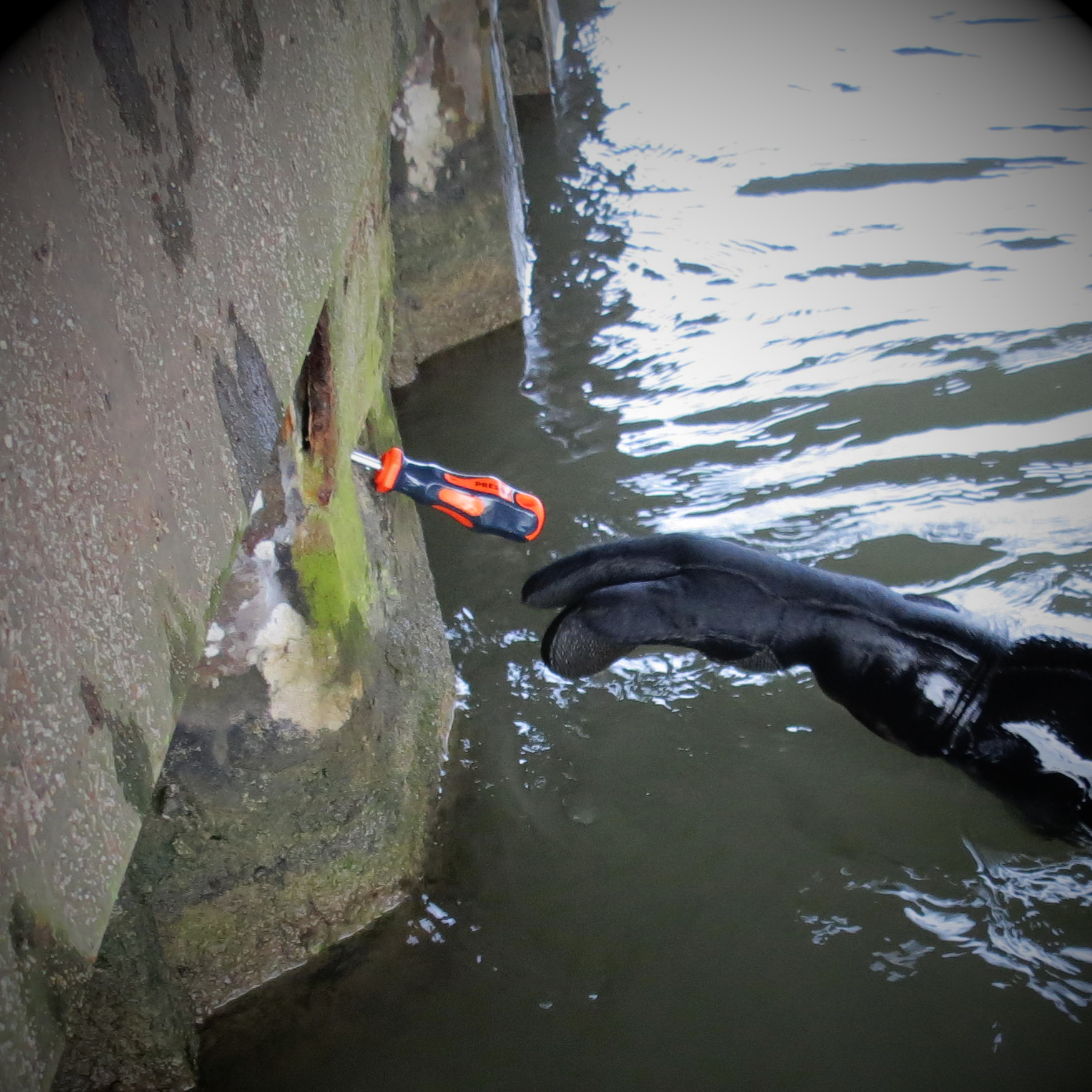 Berufstaucher im Allgemeinen sind oft sehr widrigen Bedingungen ausgesetzt. Sie bewegen sich zum Beispiel in großer Enge (z.B. Rohrleitungen) oder in gänzlich unwirtlicher Umgebung (z.B. Klärbecken). Eine Brückenprüfung in einem Kiesteich zählt da sicher nicht zu den schlimmsten Einsätzen. Trotzdem: Auch dort ist oft die Sicht gleich Null. Es herrscht „Nullsicht“, wie sie sagen. Dann kommt es auf die Hände an.