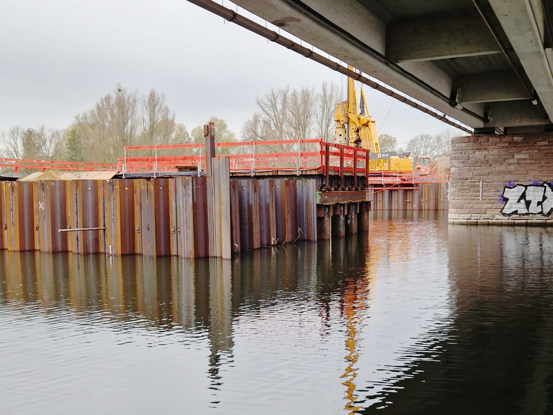 Aber auch das ist kein wirkliches Problem, sondern ändert nur die Wahl des Werkzeugs. Nach wie vor bringen wir die Spundwände in den Boden. (Kurz zur Wiederholung: Im See werden drei Spundwandkästen gebaut, um Trockendocks anzulegen. Damit bekommen wir trockene und sichere Baugruben, um die Bohrpfähle und das Stützenfundament zu bauen. – vgl. Beitrag vom 06.06.2025. „Bagger ahoi“.)