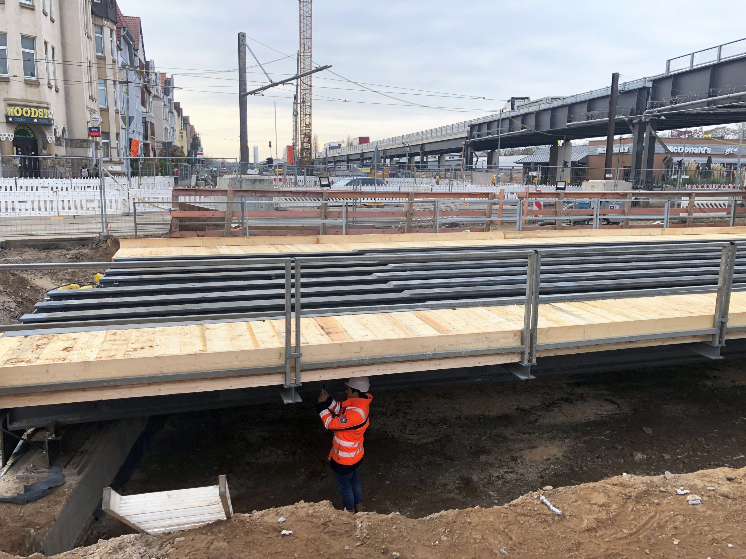 Die Behelfsbrücken überspannen letztlich die gesamte Baugrube. Das sind gut 25 Meter. Sie haben übrigens ein nettes Gimmick: Sie kommen mit ausklappbaren Gehwegen. Wenn die Brücke liegt, werden die Ausleger ausgeklappt und mit Planken ausgelegt. Fertig ist der Weg. Was spaßig klingt, hat einen ernsten Hintergrund. Die Wege sind für den Notfall gedacht. Sollte also jemals eine Stadtbahn genau über dem Baudock 8 stehen bleiben, können Fahrgäste über die Klapp-Wege die Wagen verlassen.