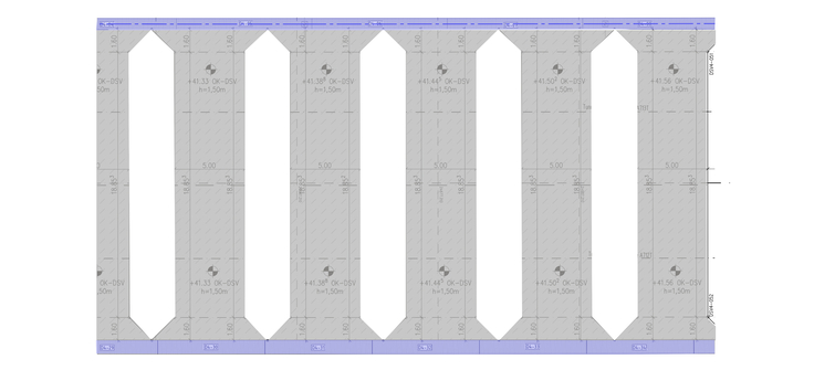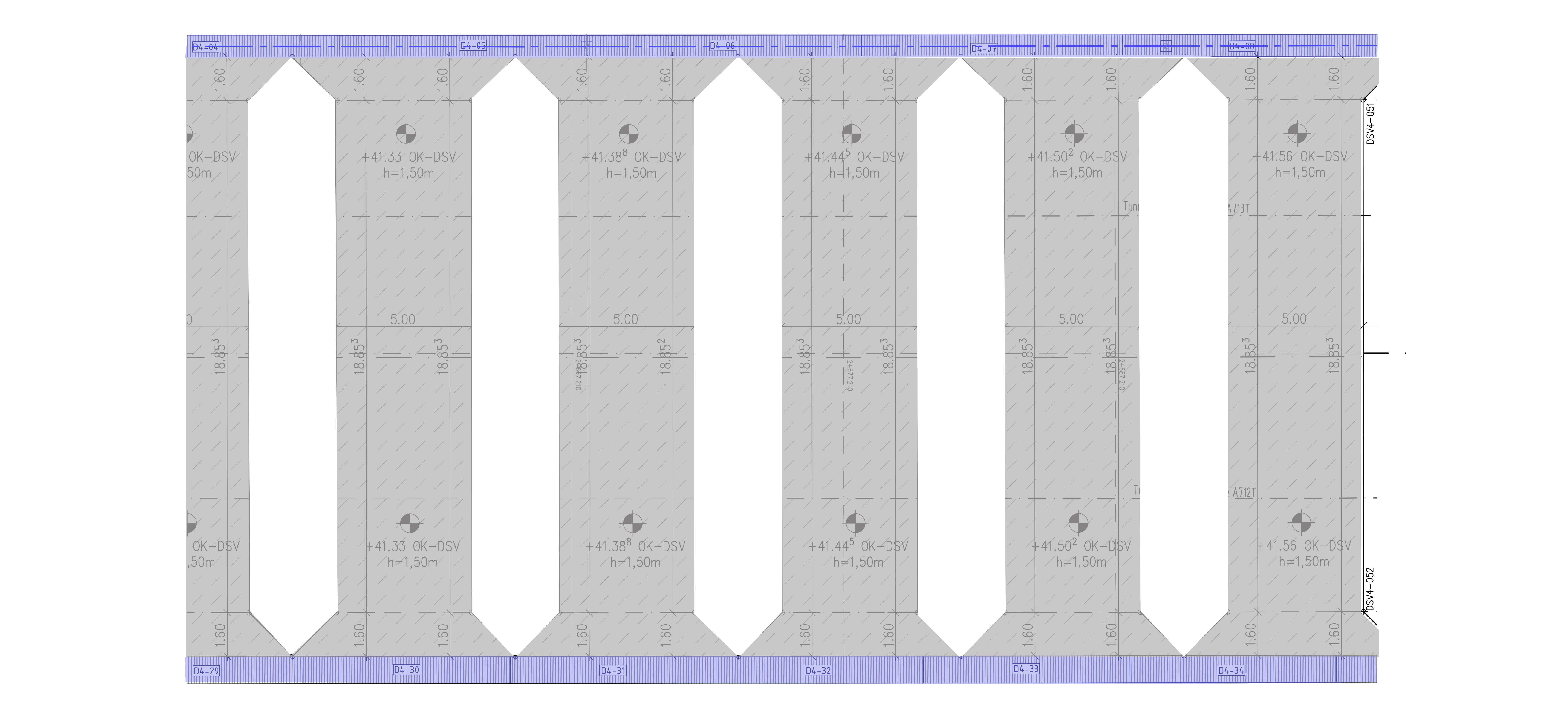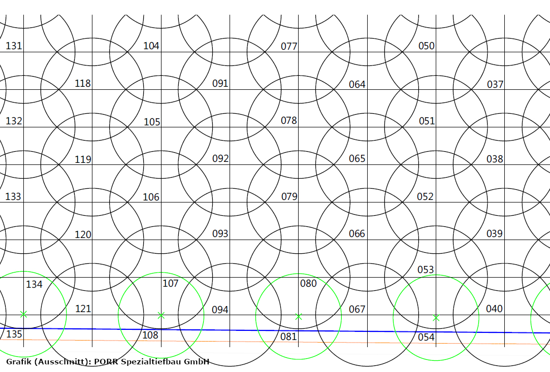 Mit dieser Daniel-Düsentrieb-Methode legen wir die Querriegel an, die zwischen den Schlitzwänden liegen und sie knapp unterhalb der künftigen Baugrubensohle (horizontal) versteifen – wenn sie denn ausgehärtet sind. Jeder Riegel ist fünf Meter breit und hat 3,20 Meter Abstand zum Nachbarriegel. 16 dieser Riegel werden in das Baudock 4 eingebaut, zusätzlich zu einem besonderen unterirdischen Wasserbehälter, den wir später einmal erklären. Rund 100 Bohrungen braucht es für alles zusammen - also Riegel und Behälter. Das Schema unten zeigt einen Ausschnitt aus der Draufsicht auf diese Konstruktion.