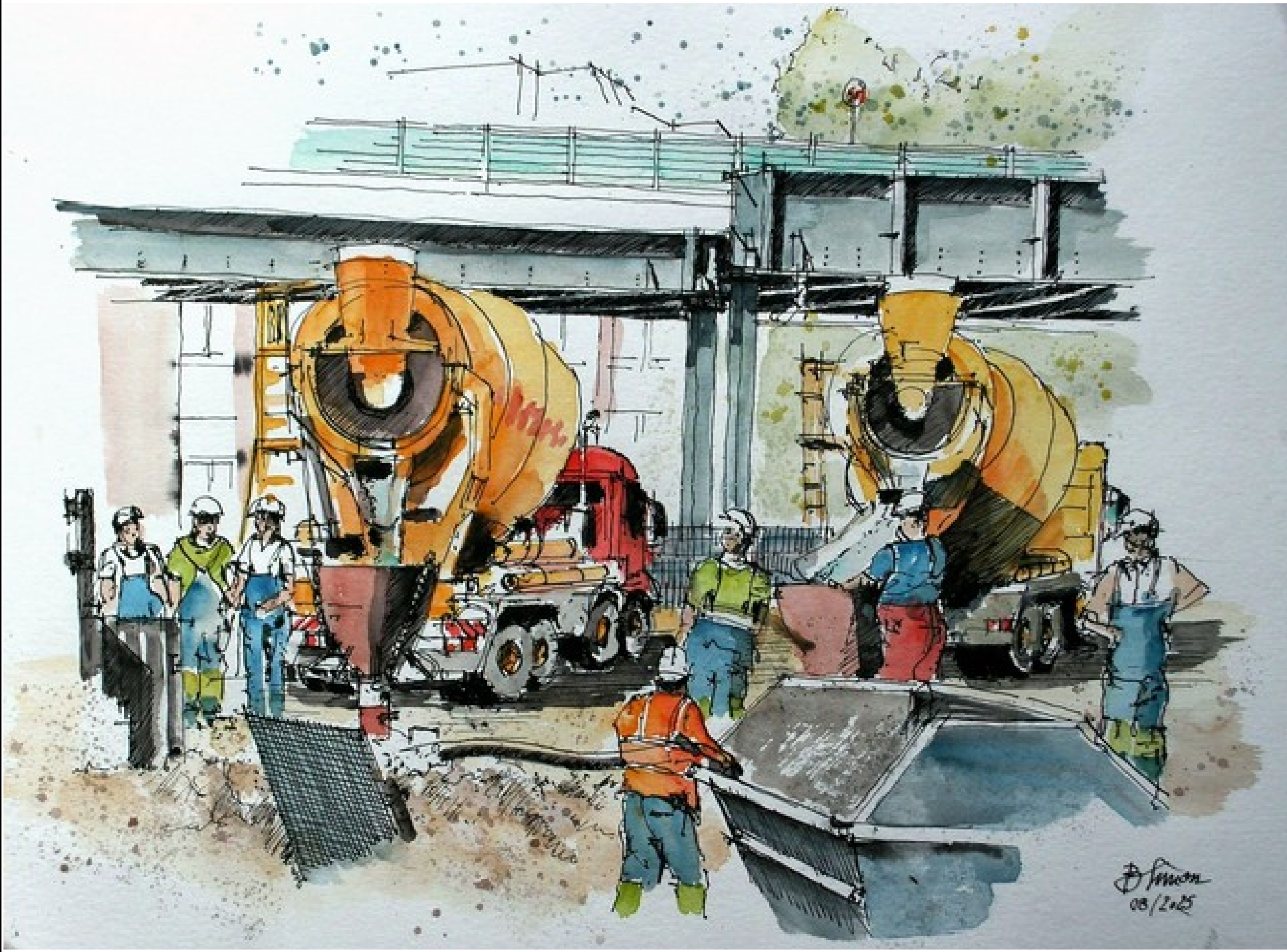 „Wenn ich zeichne, versuche ich immer, die ganze Situation einzufangen. Es sollen Bilder mit dem ganzen Drum und Dran entstehen, wie man sie als Normalmensch sieht“, sagt Simon. Warnbaken, Baustellenzäune, Kabel, Schilder – das alles gehöre dazu. „‘Gemüse‘, das eine Baustelle ausmacht“, wie er findet.