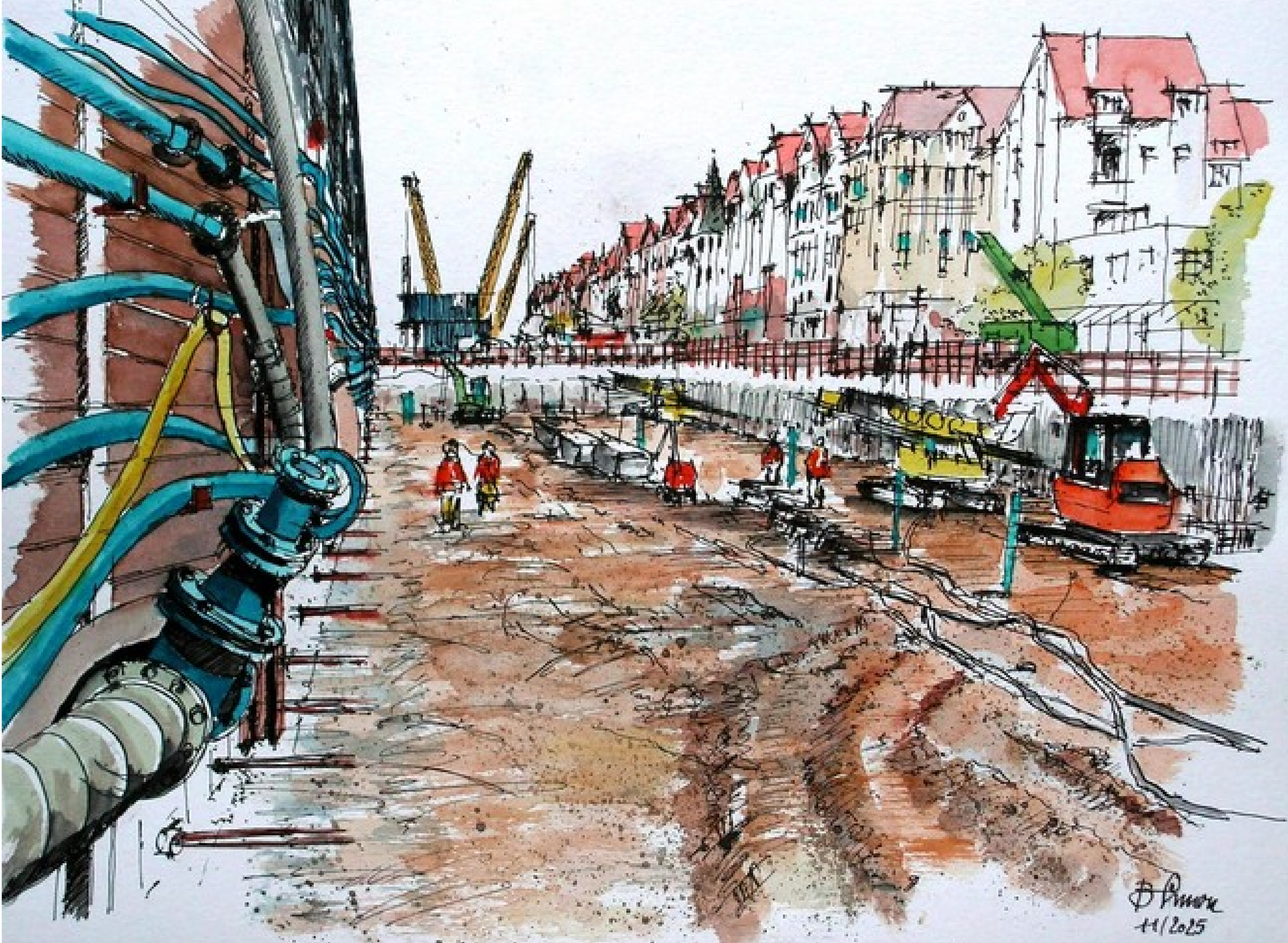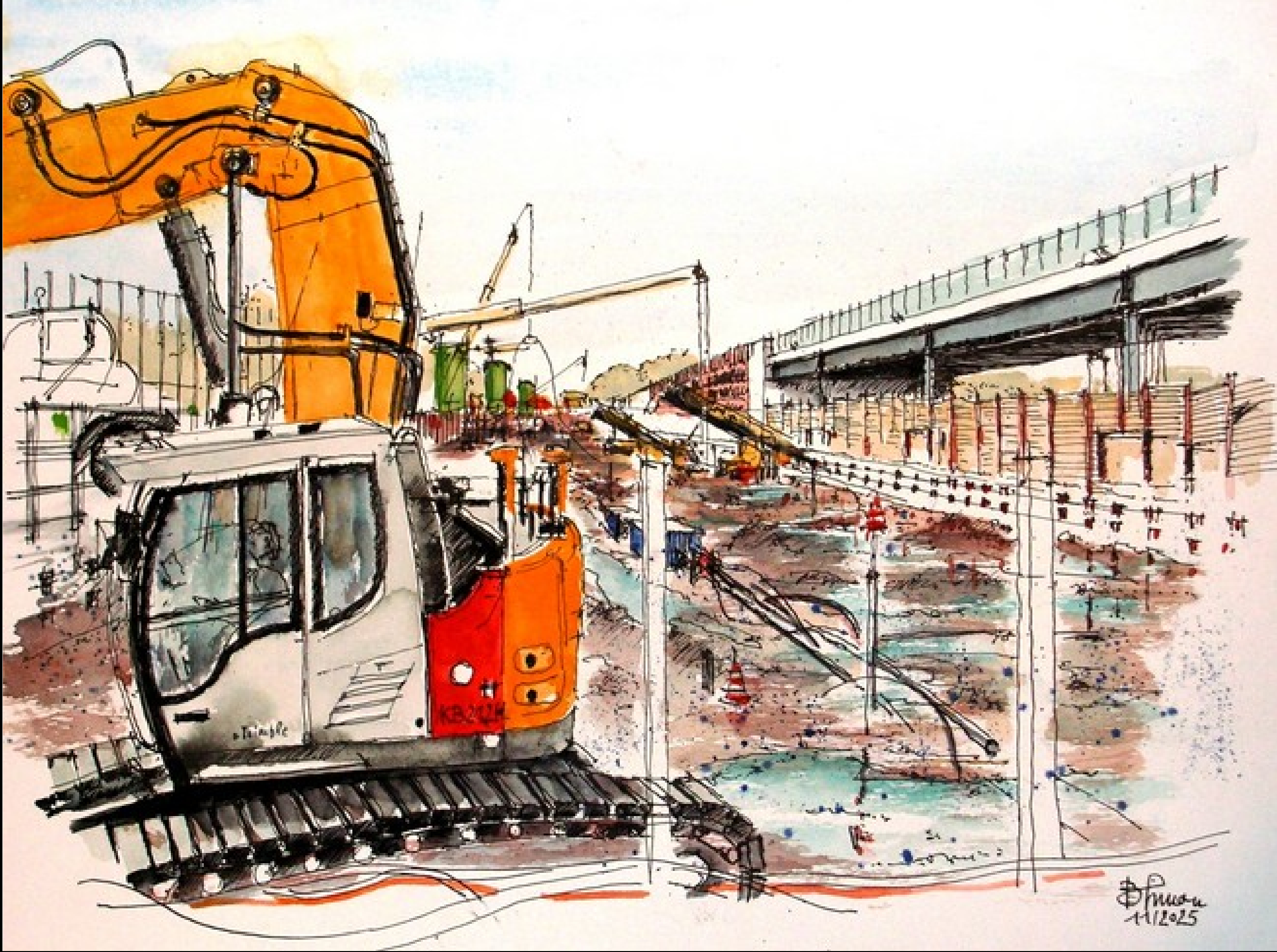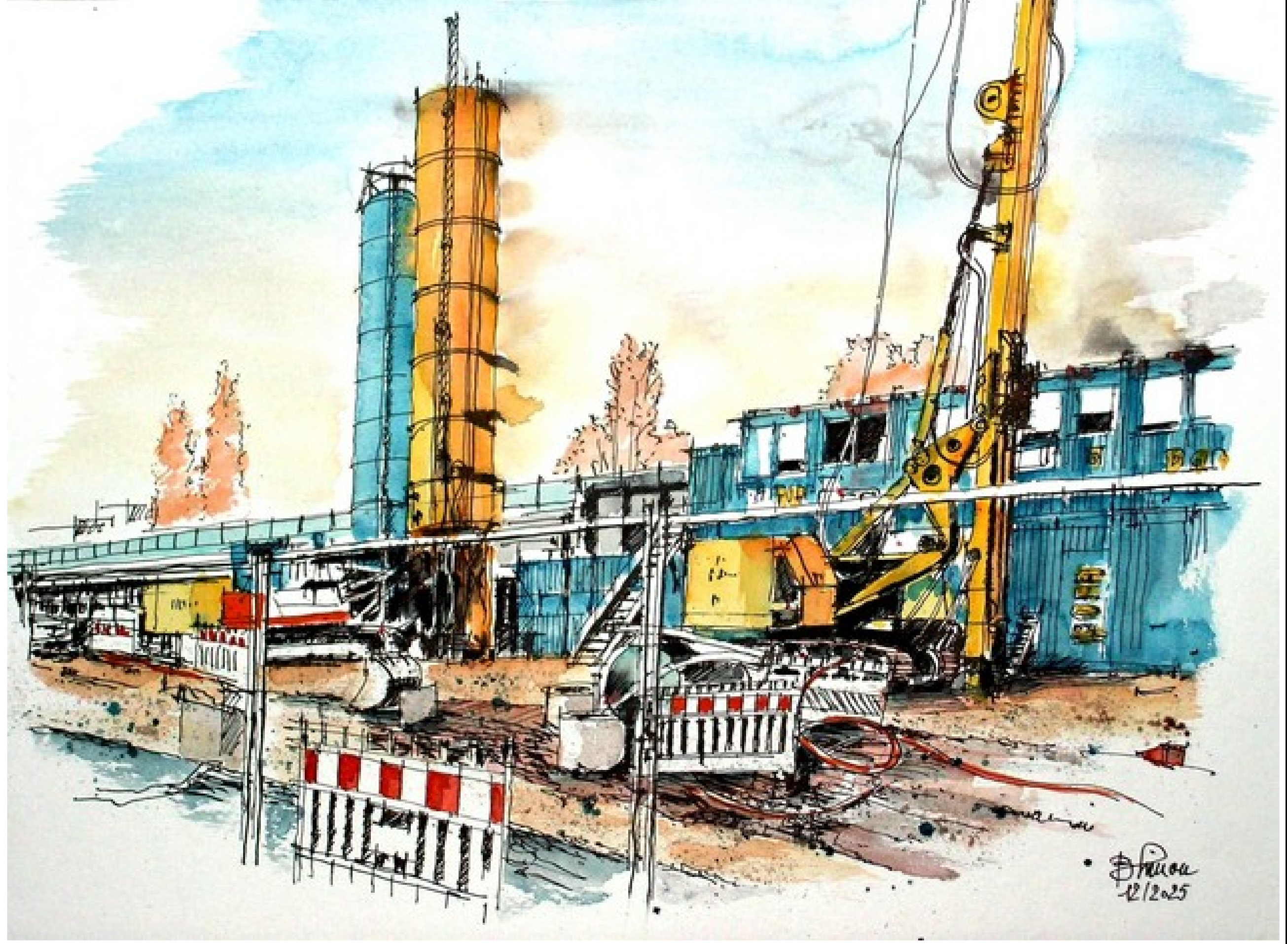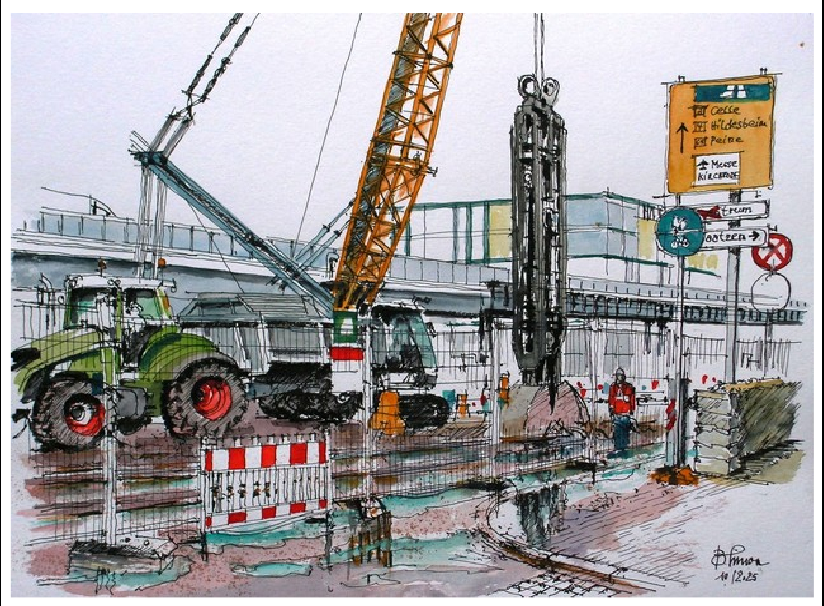 Und es gibt immer viel zu sehen! Deswegen freuen wir uns ganz besonders uns darüber, dass der Künstler und Architekt Burkard Simon unsere Arbeit auch weiterhin so interessant und inspirierend findet, dass er sie gekonnt in Aquarellen einfängt (vgl. 24.07.2025, „Südschnellweg goes art“). Seit dem Sommer war er wieder einige Male an der Baustelle zu Gast. Und weil es keinen schöneren Jahresrückblick geben kann als mit Gemälden, gibt es unten einmal eine Bildergalerie mit einer Auswahl seiner Motive.