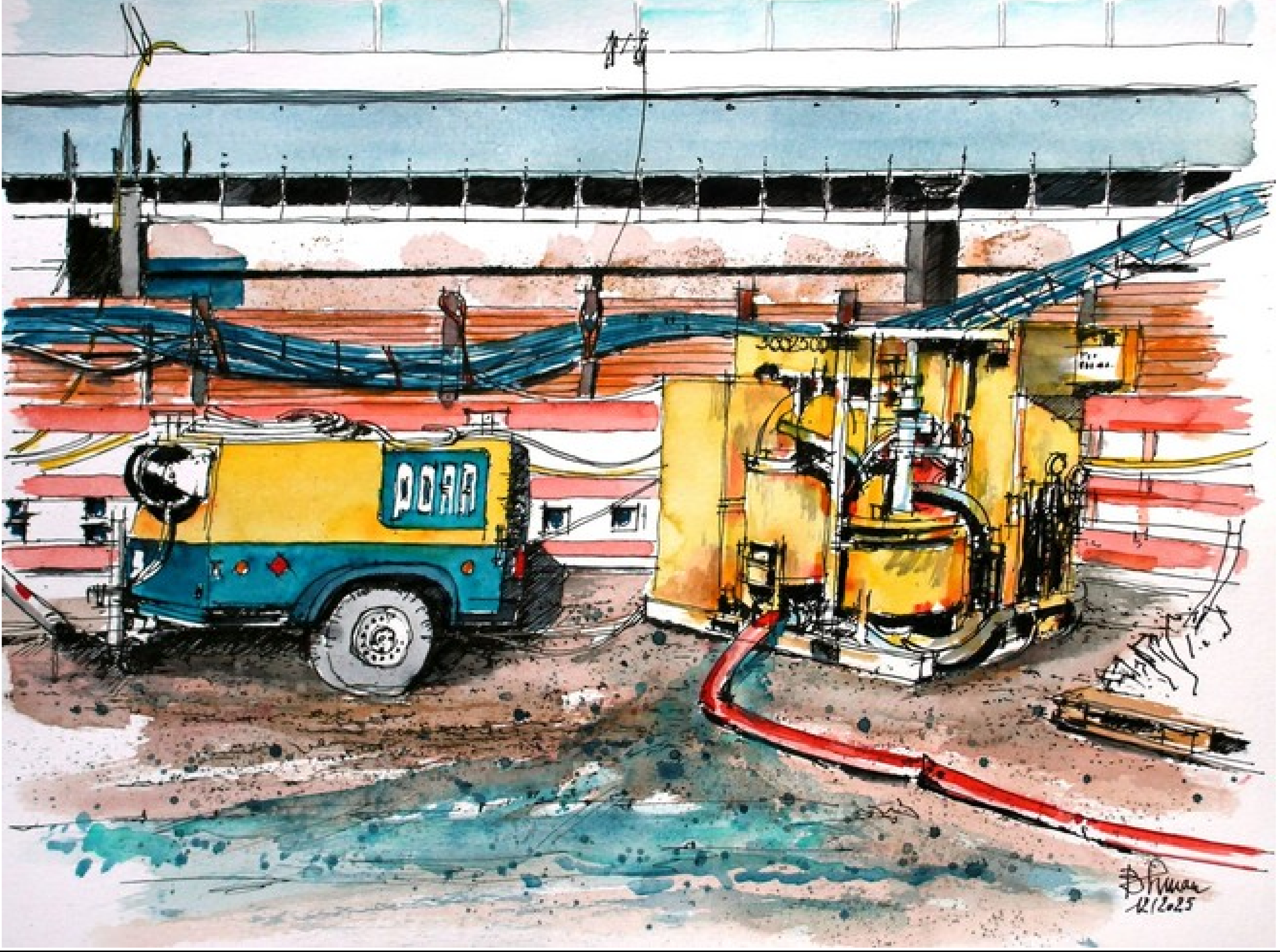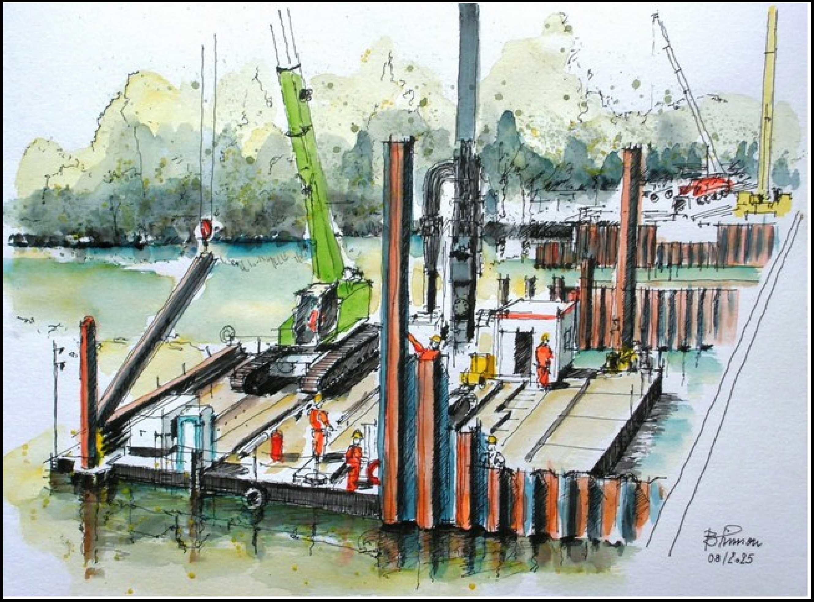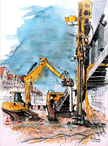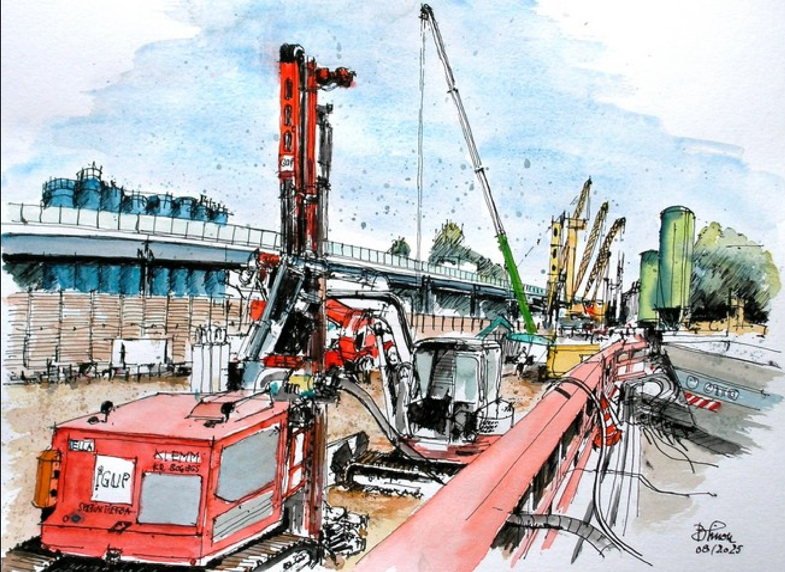 Und es gibt immer viel zu sehen! Deswegen freuen wir uns ganz besonders uns darüber, dass der Künstler und Architekt Burkard Simon unsere Arbeit auch weiterhin so interessant und inspirierend findet, dass er sie gekonnt in Aquarellen einfängt (vgl. 24.07.2025, „Südschnellweg goes art“). Seit dem Sommer war er wieder einige Male an der Baustelle zu Gast. Und weil es keinen schöneren Jahresrückblick geben kann als mit Gemälden, gibt es unten einmal eine Bildergalerie mit einer Auswahl seiner Motive.