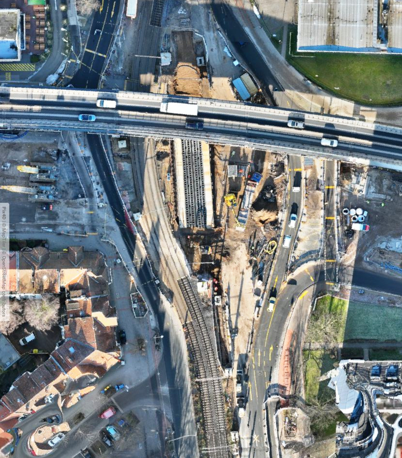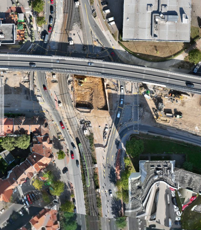 Links zu sehen ist die Kreuzung mit gerader Stadtbahnführung (und noch der alten Südschnellwegbrücke). In der Mitte entsteht Baudock 8, die Stadtbahn ist verschwenkt. Rechts ist die gerade Stadtbahnlinie wieder zu erkennnen.