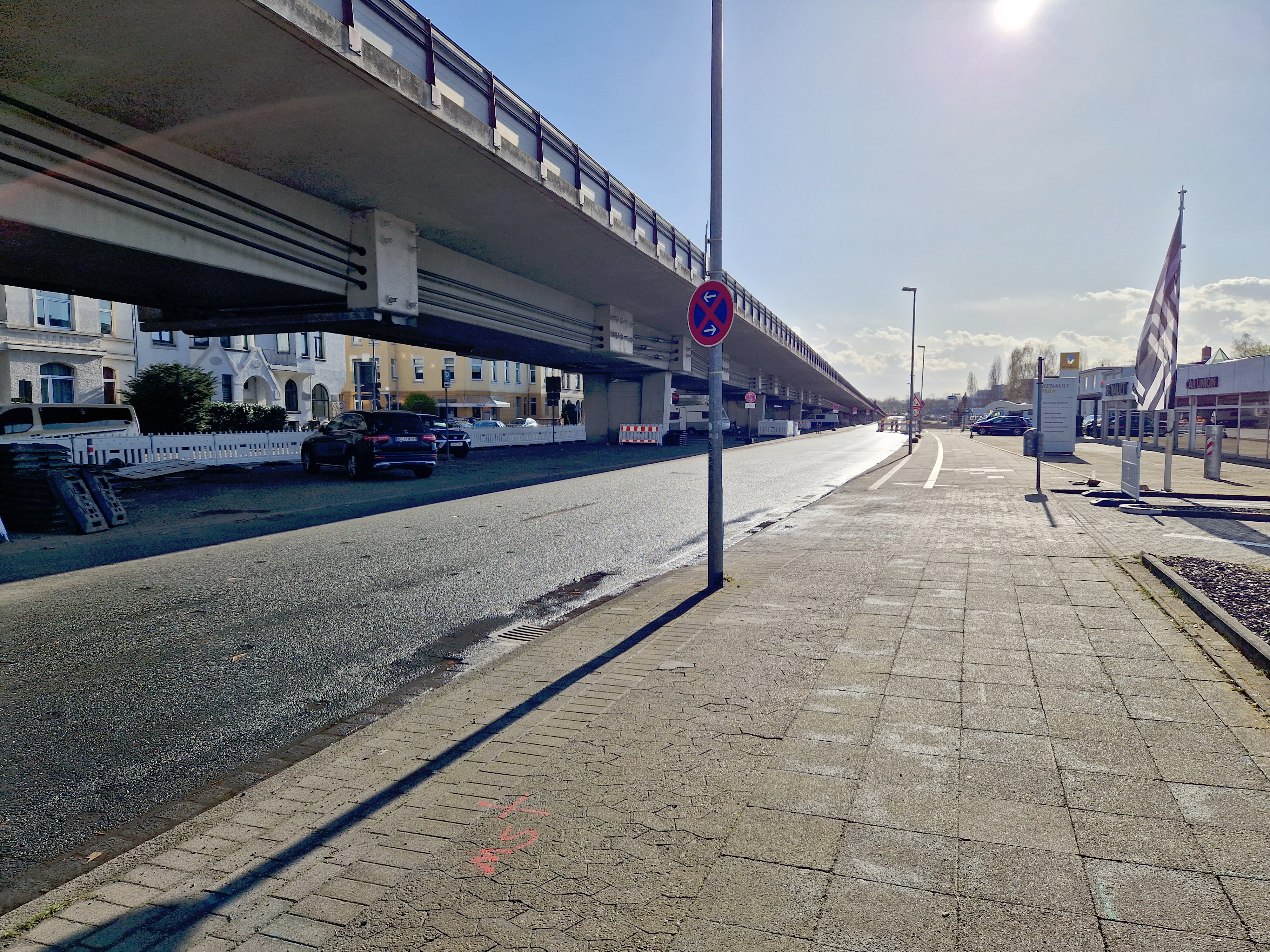 Oben drauf, auf dem Südschnellweg, haben wir der Fahrstrecke schon jetzt eine Kurve verpasst, sie quasi krumm gedengelt. Die Fahrzeuge machen seit ein paar Tagen einen Bogen um den Einsatzbereich an der Mühlenholzbrücke. Das fährt sich vielleicht wie eine Schikane, ist aber auf keinen Fall als solche gemeint! Denn dadurch bekommen unsere Fachleute lediglich ein bisschen Platz, um ihrer Arbeit gut und sicher nachgehen zu können.