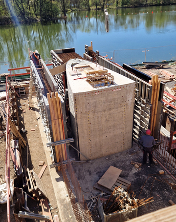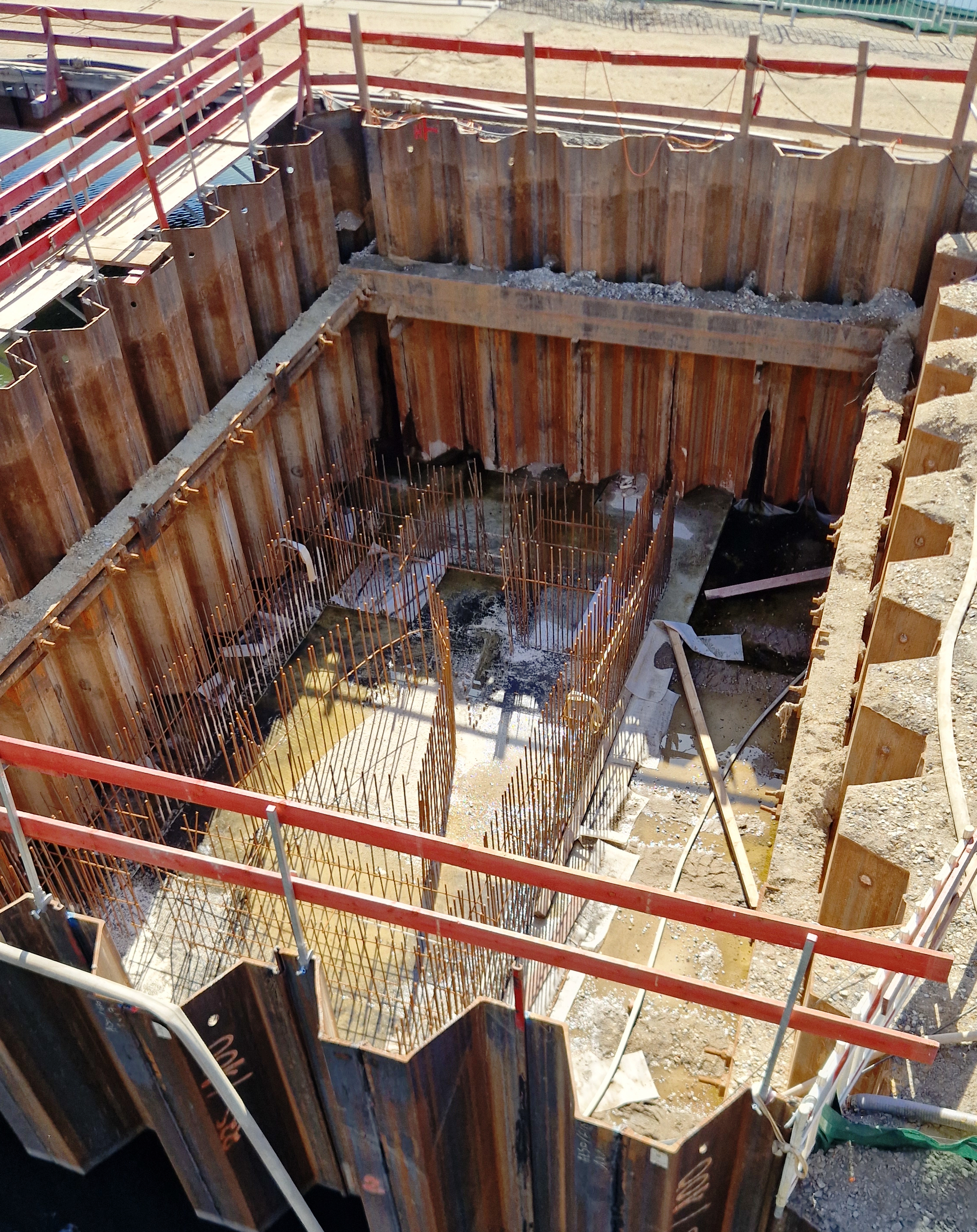 Wozu tut man das? Grundsätzlich gesprochen: Entweder, es ist zu aufwändig, Wasser aus einer Baugrube zu entfernen, oder der Wasserkörper hat in der Baugrube eine Funktion. Für unsere Tunnelbaudocks gesprochen: Hier brauchen wir das Wasser (vgl. Beitrag „Still ruht der See – noch“, vom 08.01.2026). Der hydraulische Druck sichert die Grube, während sie untenrum nochnicht befestigt ist. Denn auch hier gilt: Erst wenn das Dock ausgehoben ist, kann der Betonfußboden kommen.
