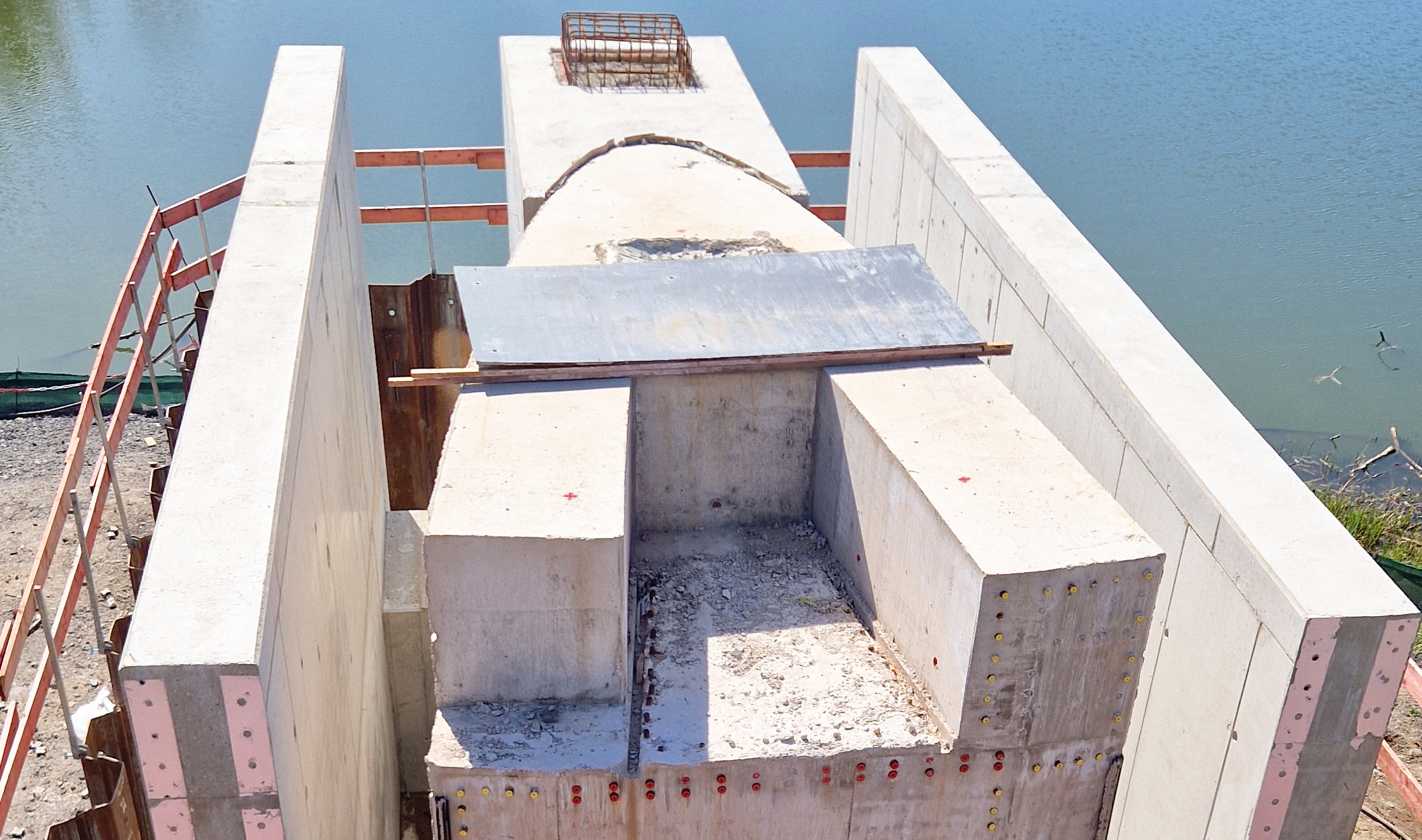 Das erste Foto unten macht deutlich, worum es geht. Mittig zu sehen ist eine Art Ellipse – wie ein A ohne Mittelbalken. Dieses Bauteil gehört zum endgültigen Pfeiler. (Streng genommen ist es nur seine erste Hälfte, die zweite, untere entsteht noch – doch das tut hier jetzt nichts zur Sache.) Die beiden Wände rechts und links sowie die eckige „Haube“ auf dem A hingegen werden später abgebrochen.
