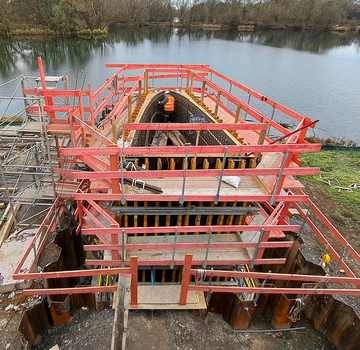Auch am anderen Ufer wird so ein Pfeiler entstehen. Das war es dann aber auch schon. Das Gewässer lassen wir in Ruhe. Es bleibt pfeilerlos. Stattdessen wird die Brücke den Fluss später mit einem großen Feld überspannen. Auch während des Baus bringt das Vorteile für die Leine. Die Arbeit können wir gut von Land aus erledigen. Der Gewässerschutz gewinnt.