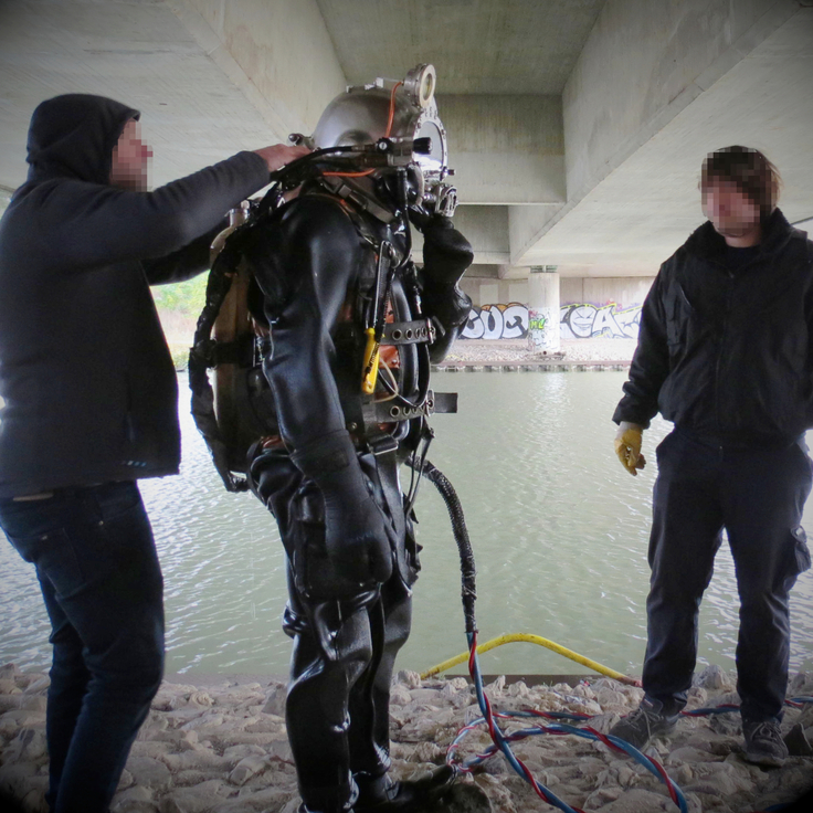 Das große Besteck packten die Experten am Südschnellweg also nicht aus. Denn normalerweise gehen sie nicht einfach so baden. Sie stecken in einem Trockentauchanzug, tragen einen Helm und werden über eine Schlauchleine von Land aus mit Luft versorgt.