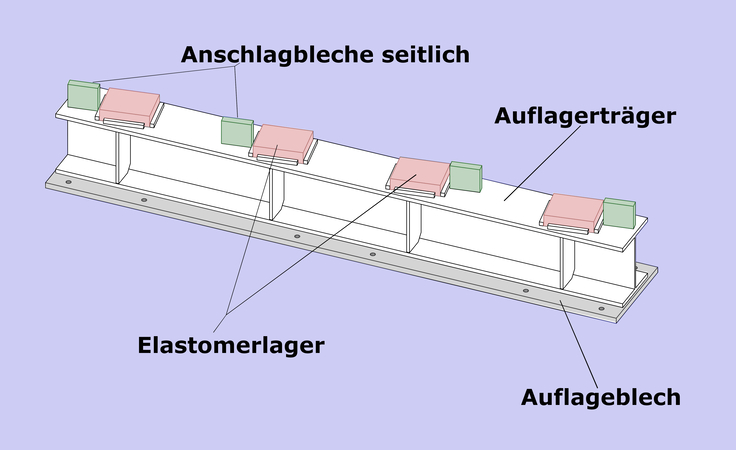 Oben auf den Trägern werden nochmals dicke Bleche aufgeschweißt. Sie dienen zum einen als seitlicher Anschlag für die Behelfsbrücken. Zum anderen ergeben sie kleine Kästchen, in denen je ein Gummipuffer eingelegt wird (vgl. Skizze unten) – ein so genanntes Elastomerlager. Es ist 25 mal 20 Zentimeter groß und ein kleines bisschen dicker als sechs Zentimeter.