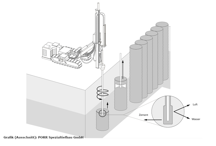 Die Kurzfassung: „Aus vertikalen Säulen bauen wir horizontale Riegel, die zusammen eine gitterrostähnliche Struktur ergeben, die die Baugruben an ihrer Sohle statisch sichern. Und das alles unterirdisch.“ Diese Miniversion einer Erklärung wäre aber ebenso unzulänglich wie die Miniversion von Schillers „Glocke“ (Loch in Erde, Bronze rinn, Glocke fertig, bim bim bim.). Deswegen also noch einmal – mit mehr Details.
