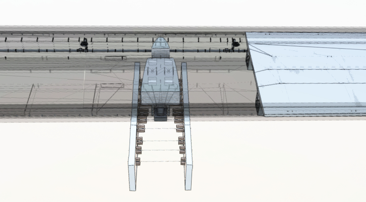 Damit die erste Brückenhälfte auch in ihrer provisorischen Position statisch austariert ist, hat der Pfeiler zum Beispiel die Haube auf dem A. Die Haube verlängert den Pfeiler und stellt weitere Auflagefläche bereit, um die Lasten sauber abzuleiten.