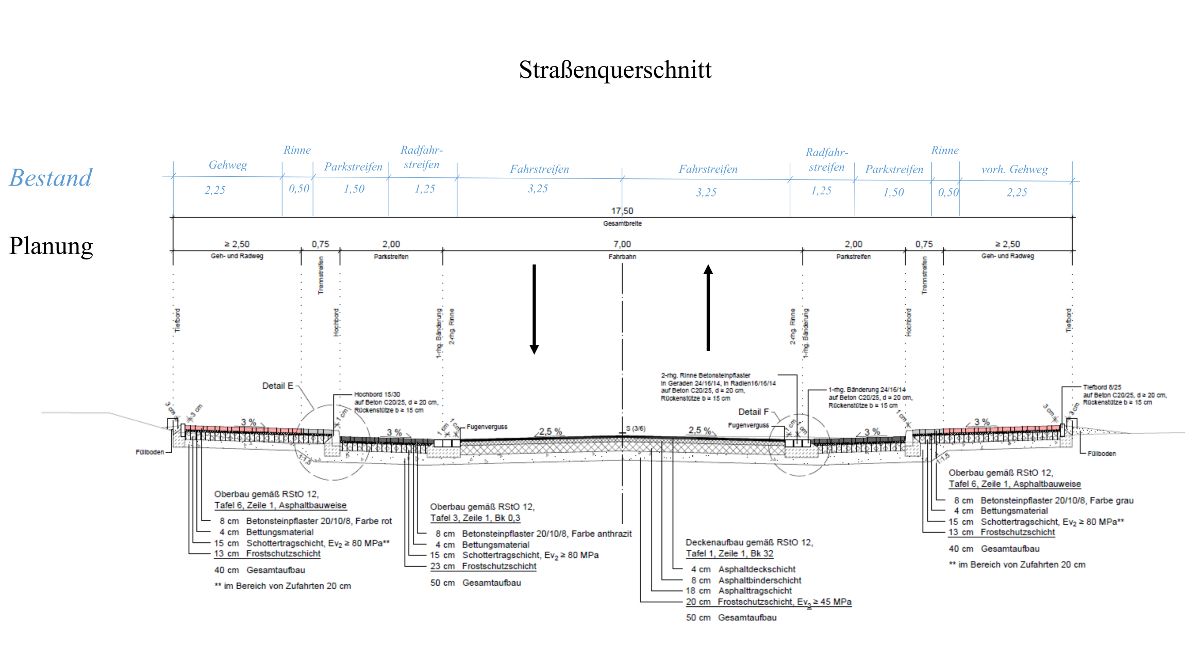Vorhanden ist ein überbreiter Straßenquerschnitt (17,50 m) mit einer Fahrbahnbreite von 6,50 m, einem 3,25 m Mehrzweckstreifen (Radfahrstreifen plus Parkstreifen) und einem 2,25 m breiten Gehweg.