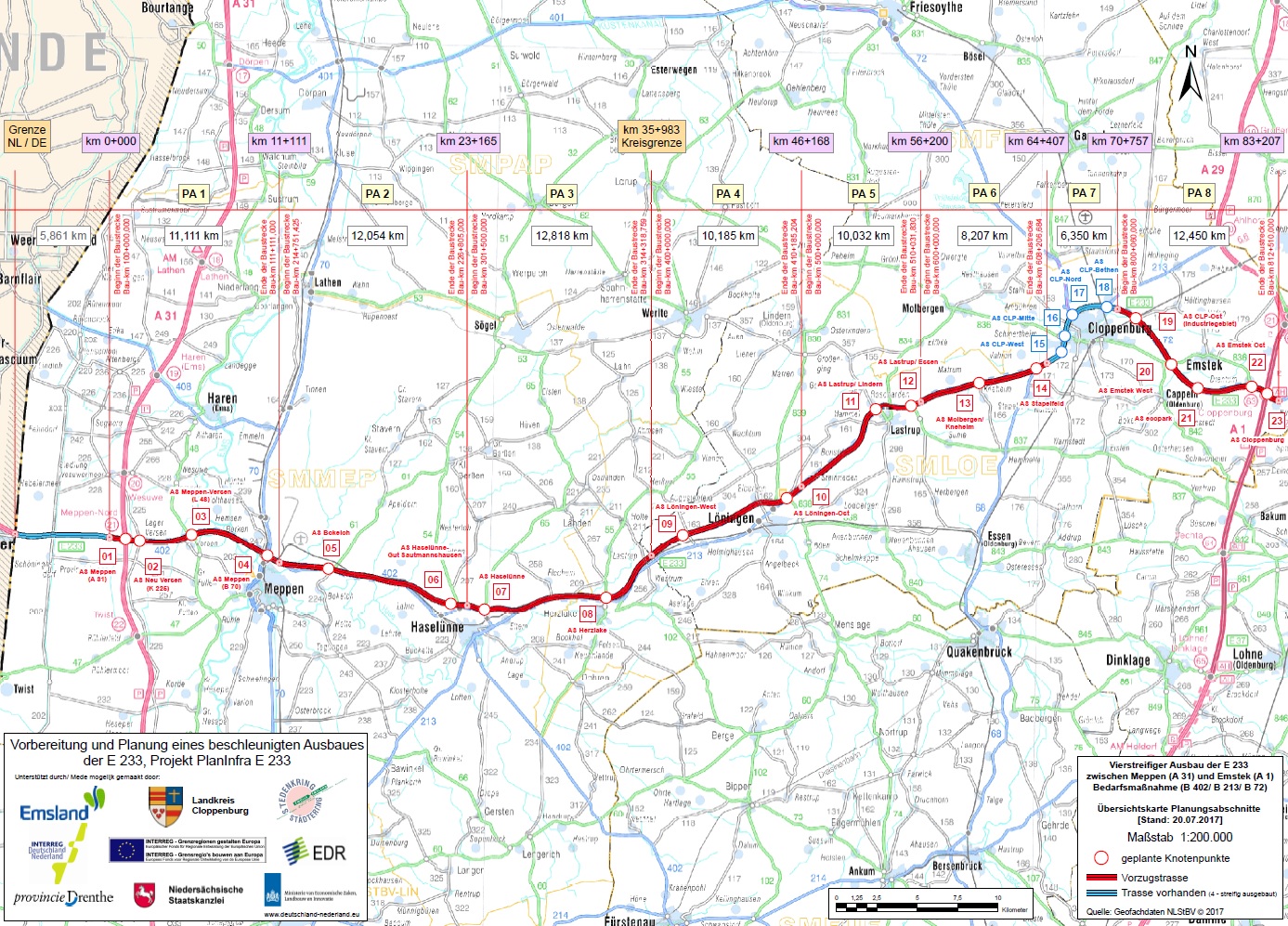 Bereits Ende 2008 hatten das Land Niedersachsen, der Städtering Zwolle – Emsland sowie die Landkreise Cloppenburg und Emsland eine Vereinbarung zur Durchführung und Finanzierung der Planung abgeschlossen. Die Planung erfolgt unter der Federführung der Landkreise Emsland und Cloppenburg. Aktuelle Informationen zum Fortgang der Planung finden Sie unter www.e233.de.