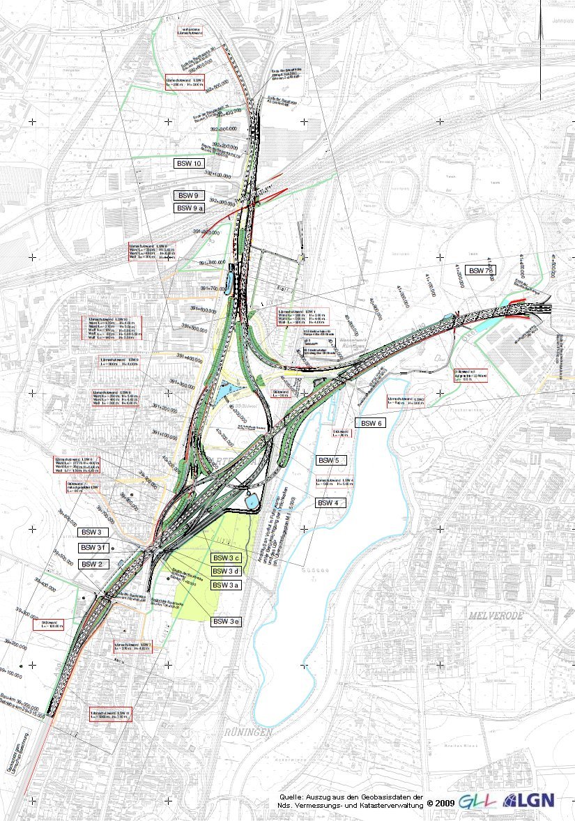 Nachfolgend werden die Positionen der vorgesehenen Lärmschutzeinrichtungen beschrieben. Die Bezeichnung "Lärmschutz" in der Liste entspricht "LSW" in der Karte.