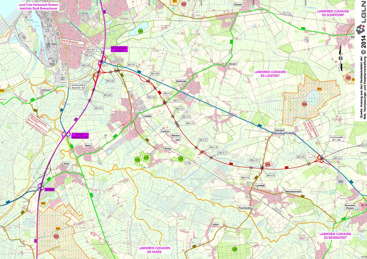 In der Übersichtkarte ist der optimierte Trassenverlauf der Küstenautobahn im Abschnitt 4 dargestellt. Ebenso sind die nach derzeitigem Planungsstand notwendigen Bauwerke sowie die Ausbildung des Autobahndreiecks Loxstedt erkennbar.
