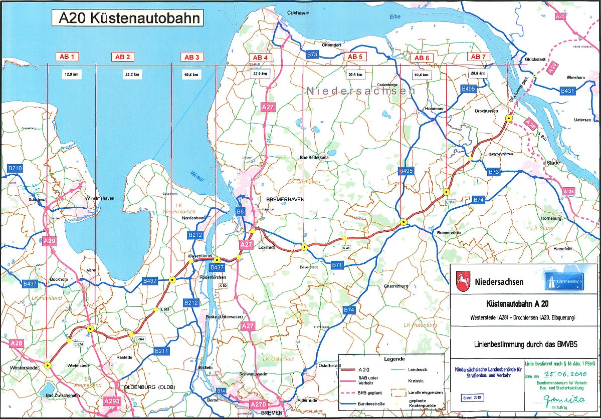 Am 25. Juni 2010 hat der Parlamentarische Staatssekretär beim Bundesverkehrsminister, Enak Ferlemann, dem seinerzeitigen niedersächsischen Minister für Wirtschaft, Arbeit und Verkehr, Jörg Bode, die Linienbestimmungsunterlagen für die Küstenautobahn bei der IHK in Stade überreicht. Gleichzeitig wurde die bislang als A 22 bezeichnete Autobahn in A 20 umbenannt.