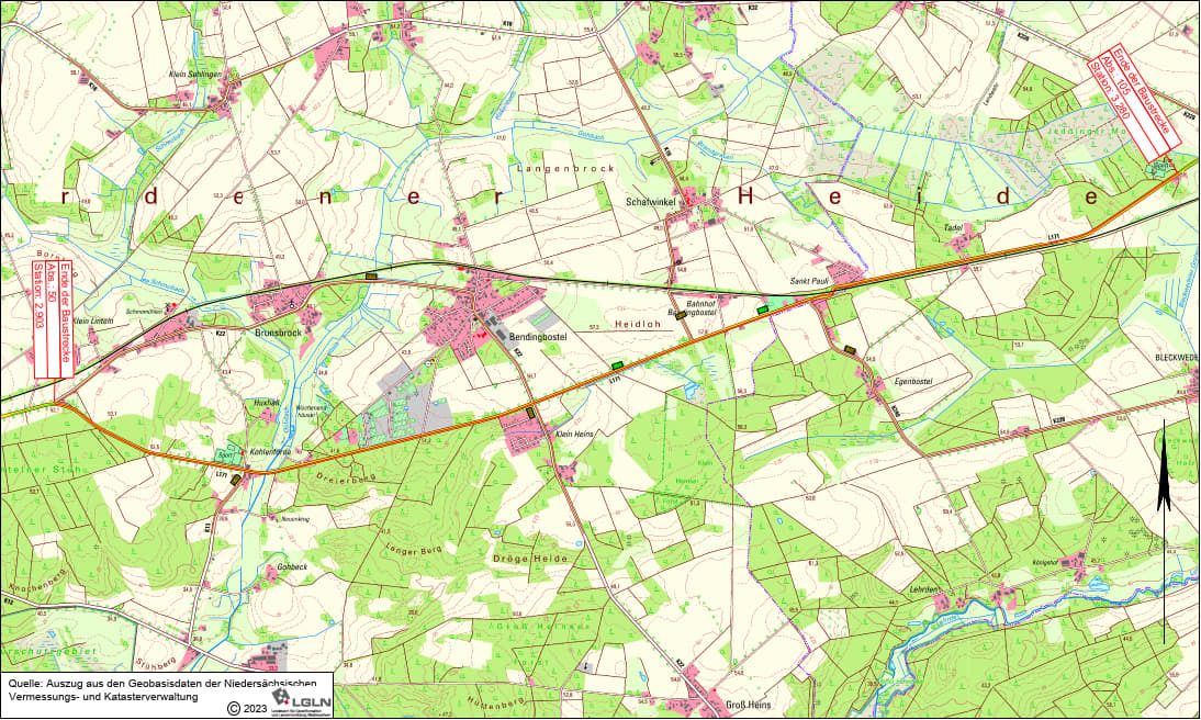 Teile der Strecke sind zudem überwiegend landwirtschaftlich genutzte Flächen, historische Waldstandorte und prägende Alleen. Das Bauende des neuen Radwegs befindet sich westlich der Ortschaft Jeddingen auf Höhe des Sportplatzes. Es erfolgt somit eine direkte Verknüpfung an den bestehenden Radweg, ohne dass die Fahrbahn überquert werden muss.