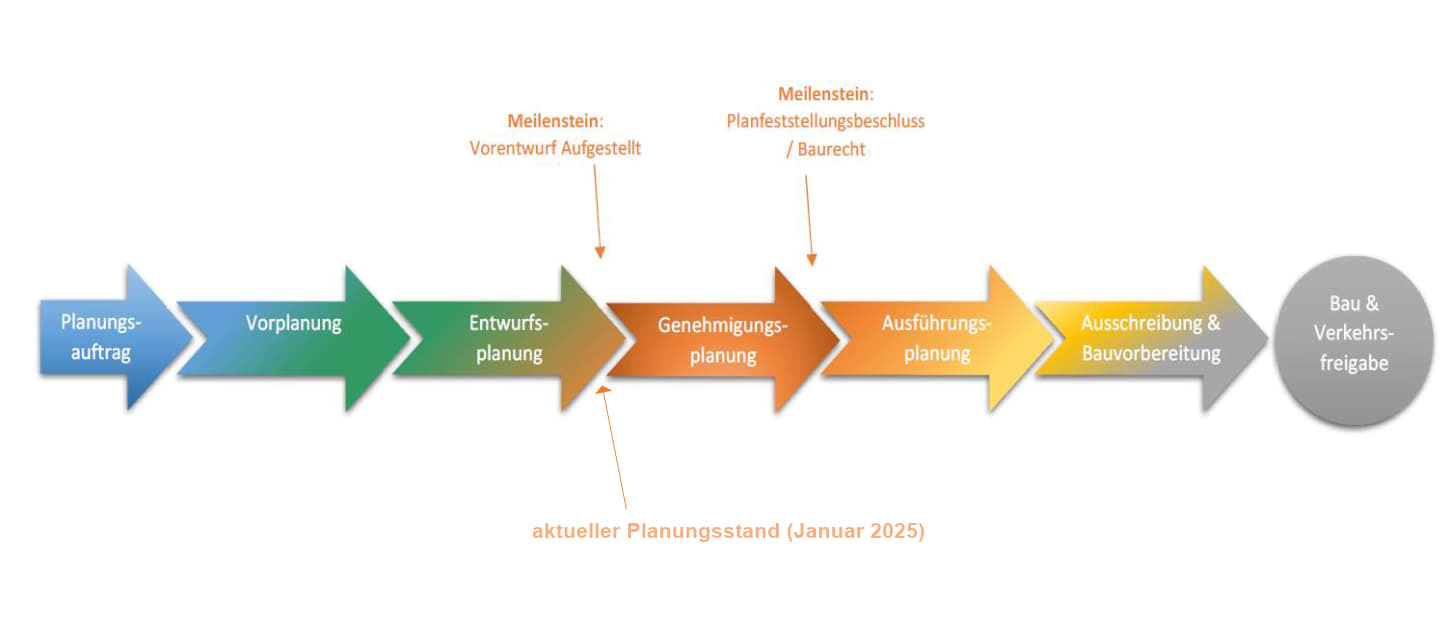 Die technische Planung des Radwegneubaus ist soweit abgeschlossen. Die Umweltfachplanungen müssen aber noch abgeschlossen, eingepflegt und berücksichtigt werden. Gegebenenfalls können sich noch geringe Änderungen ergeben, etwa aufgrund einzelner Schutzgüter wie dem Artenschutz oder von Eigentumsfragen.