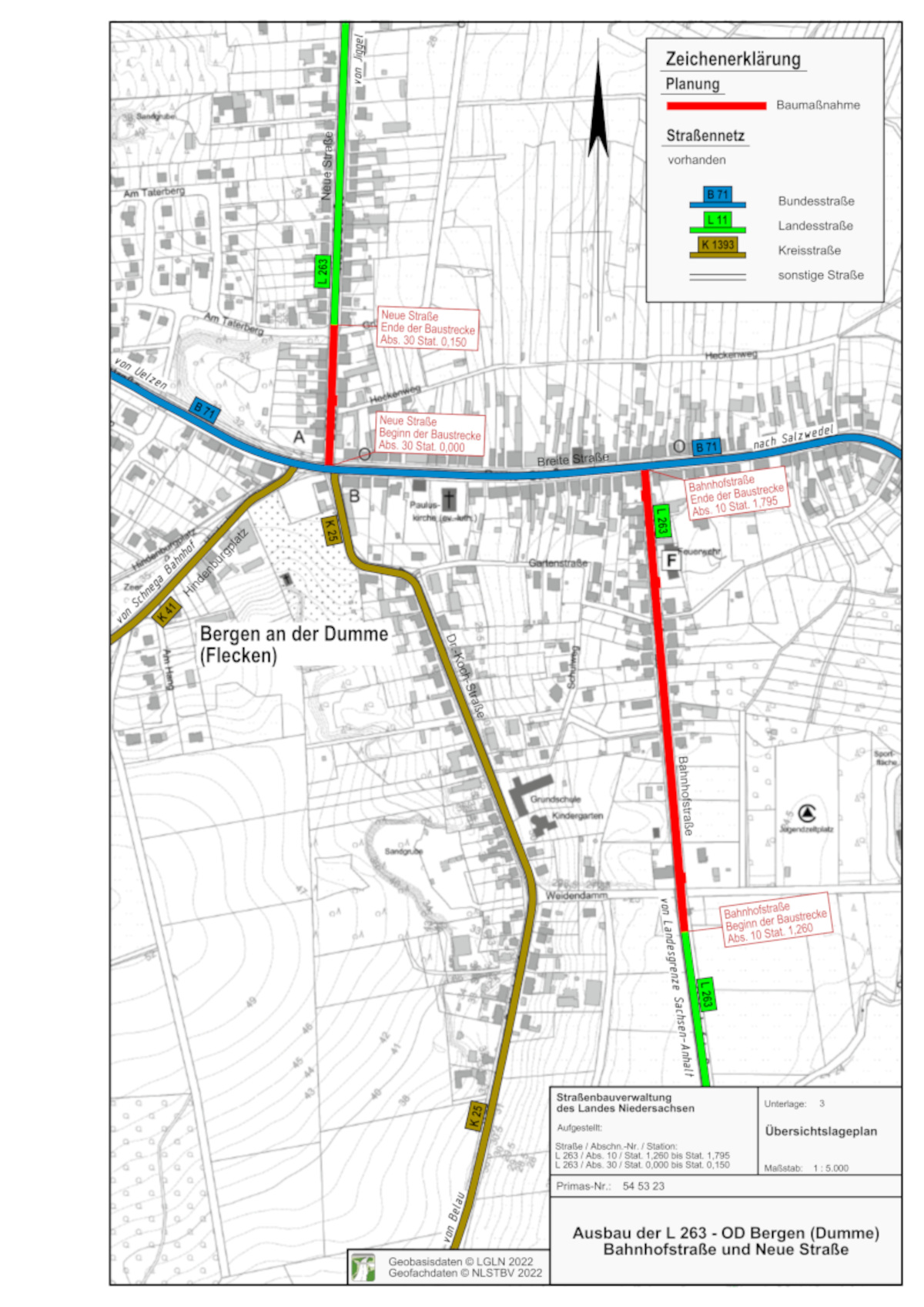 Das Bauvorhaben wird als Gemeinschaftsmaßnahme mit dem Flecken Bergen an der Dumme und dem Wasser-Verband-Wendland durchgeführt. Dabei werden beide Abschnitte der Landesstraße 263 – Bahnhofstraße und Neue Straße – nacheinander grundhaft erneuert. Auf der Bahnhofstraße (Bauabschnitt 1) beträgt die Ausbaulänge rund 530 Meter, auf der „Neuen Straße“ (Bauabschnitt 2) rund 150 Meter.