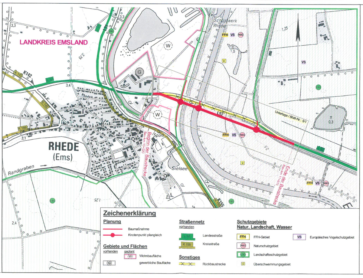 Die Ems- und die Flutmuldenbrücke im Zuge der L 52 östlich der Ems in Rhede (Landkreis Emsland) sind abgängig und werden erneuert. Vorhabens- und Baulastträger sind für die Flutmuldenbrücke die Niedersächsische Landesbehörde für Straßenbau und Verkehr, Geschäftsbereich Lingen, und für die Emsbrücke die Bundesrepublik Deutschland, vertreten durch das Wasserstraßen- und Schifffahrtsamt Meppen.